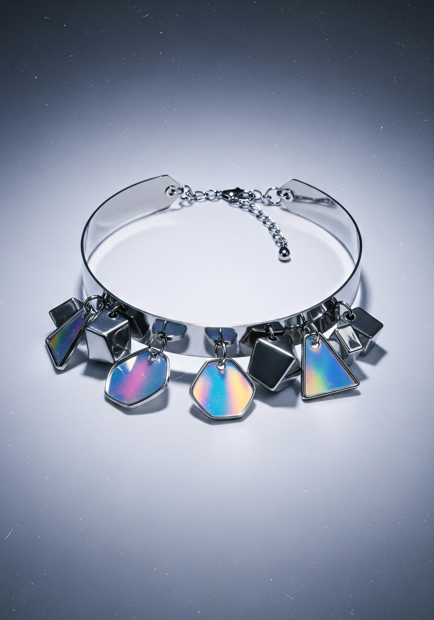 A silver choker necklace with holographic geometric charms, set against a gradient background, showcasing its modern and elegant design.