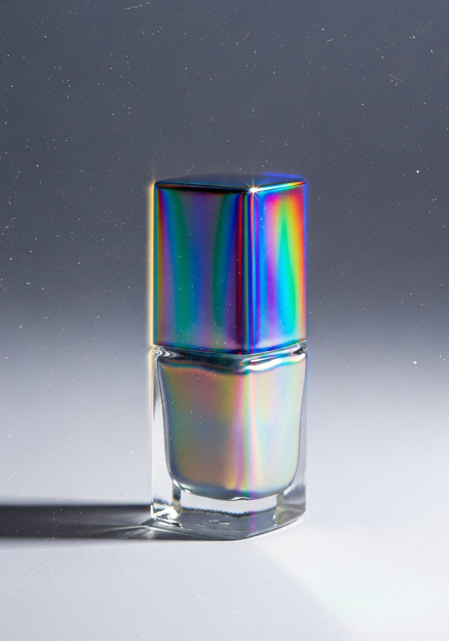 A nail polish bottle with a holographic cap and gradient glass, set against a neutral background with vibrant lighting.