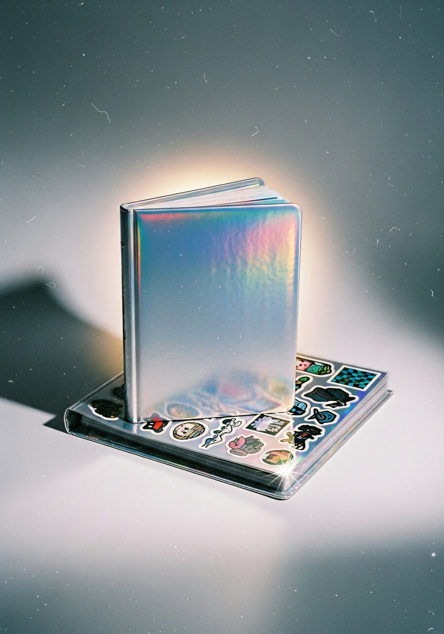 A holographic notebook and a sticker-covered notebook arranged on a light background, showcasing vibrant colors and creative designs.