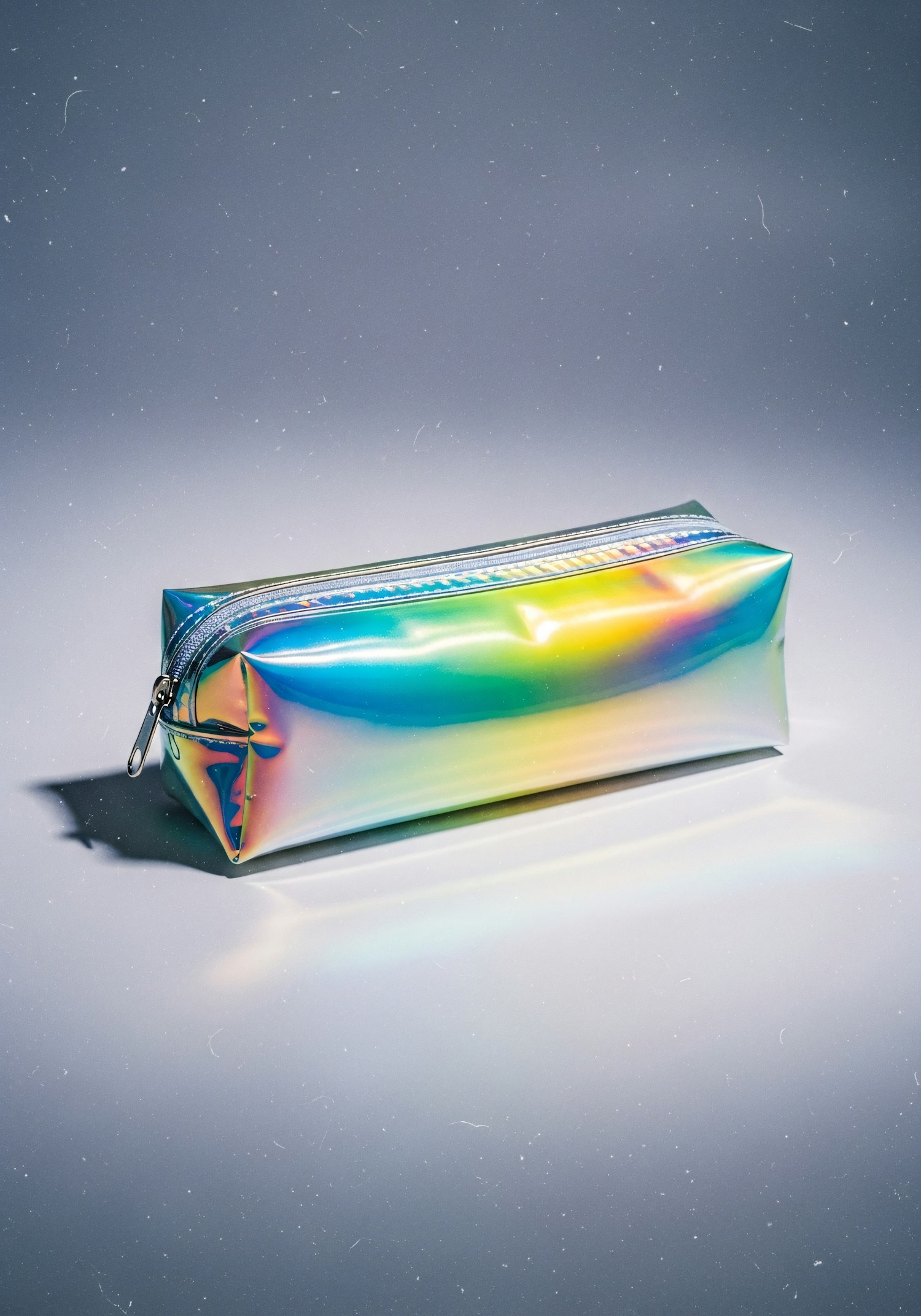 A holographic rectangular pouch with a zipper, reflecting vibrant colors, set against a neutral background.