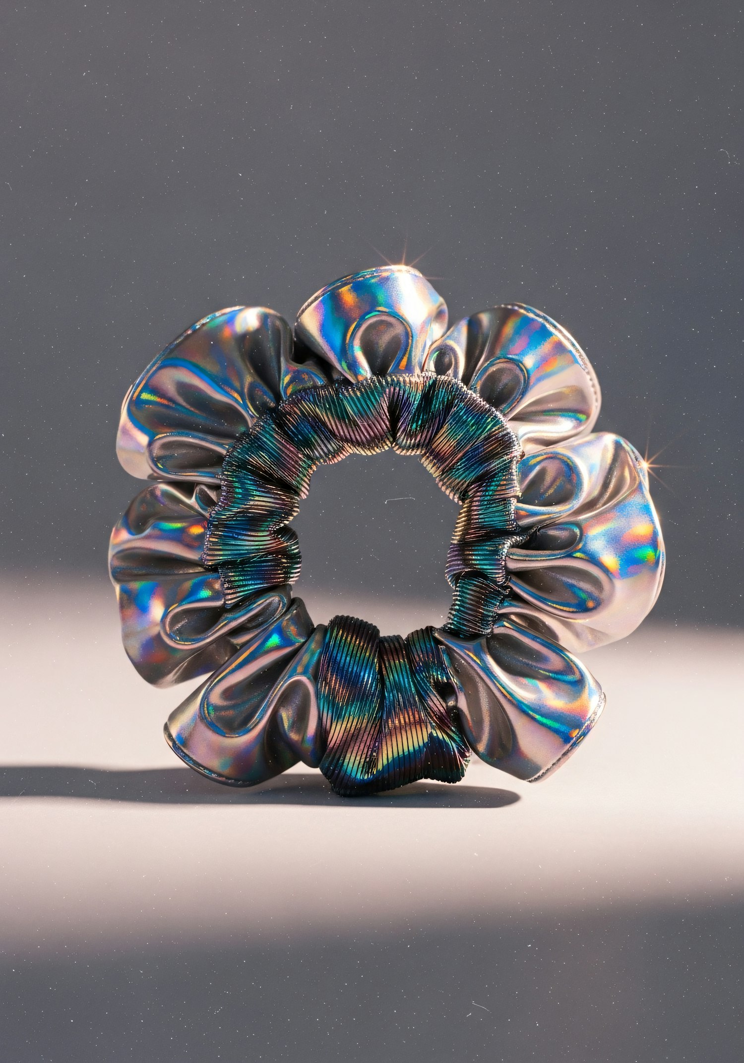 A holographic scrunchie with a metallic finish, reflecting vibrant colors under soft lighting, set against a neutral background.