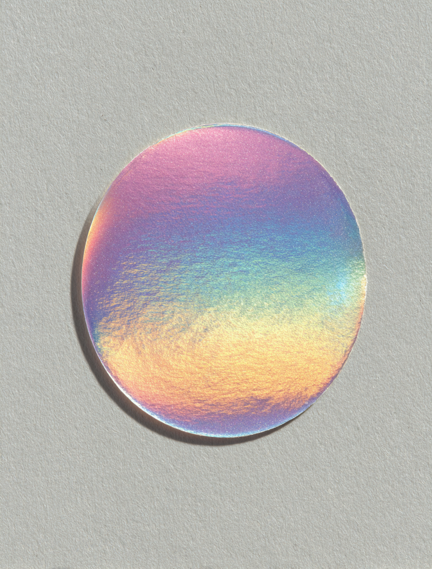 A holographic circular sticker with a vibrant gradient of colors on a textured gray background, showcasing a reflective and dynamic surface.