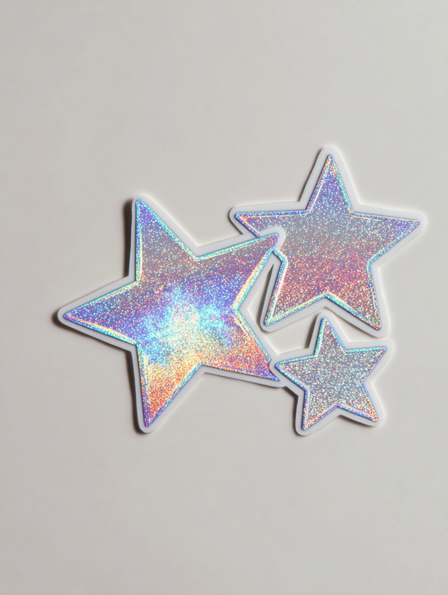 Three holographic star stickers with shimmering rainbow hues on a neutral background, creating a vibrant and eye-catching display.