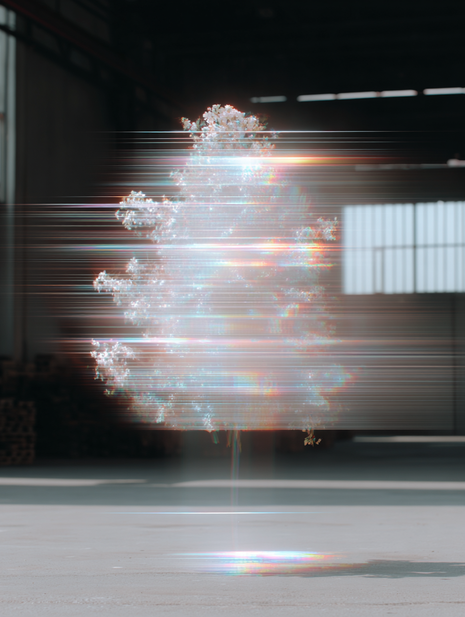 A glowing, holographic tree-like structure with light streaks in an industrial setting, creating a surreal and futuristic atmosphere.