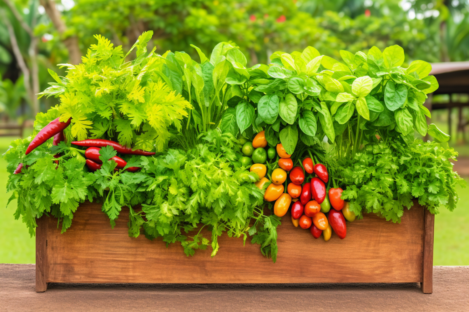 Lush wooden planter with fresh basil, cilantro, and colorful peppers in a garden setting.
