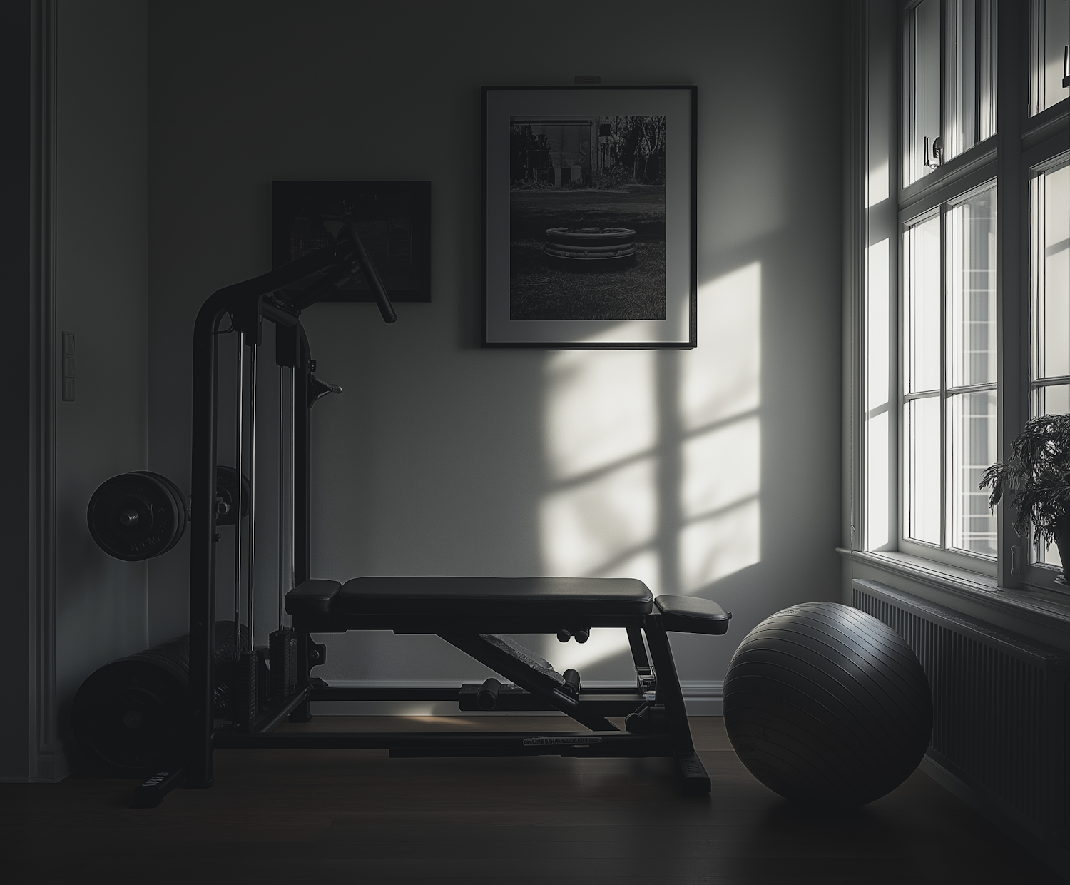 A serene home gym with a weight bench, stability ball, and framed photos, bathed in soft natural light from a large window.