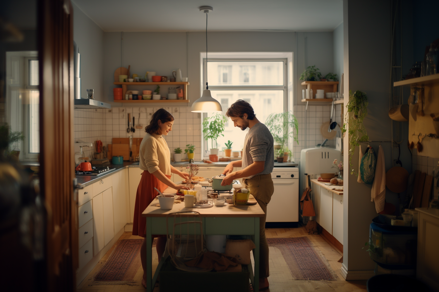 A couple cooking together in a cozy, plant-filled kitchen with warm lighting and colorful decor.