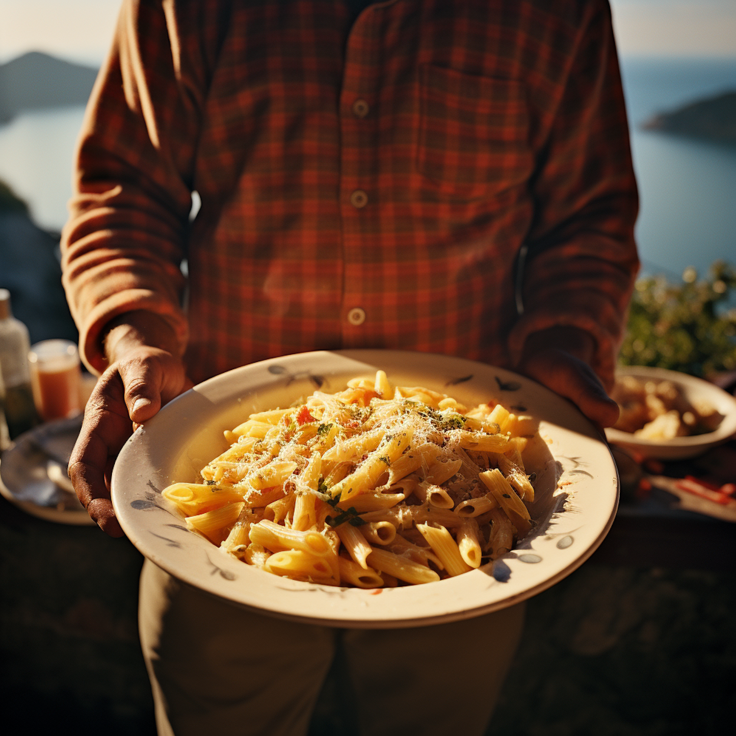 A person holds a plate of penne pasta with cheese and herbs, set against a scenic coastal backdrop.