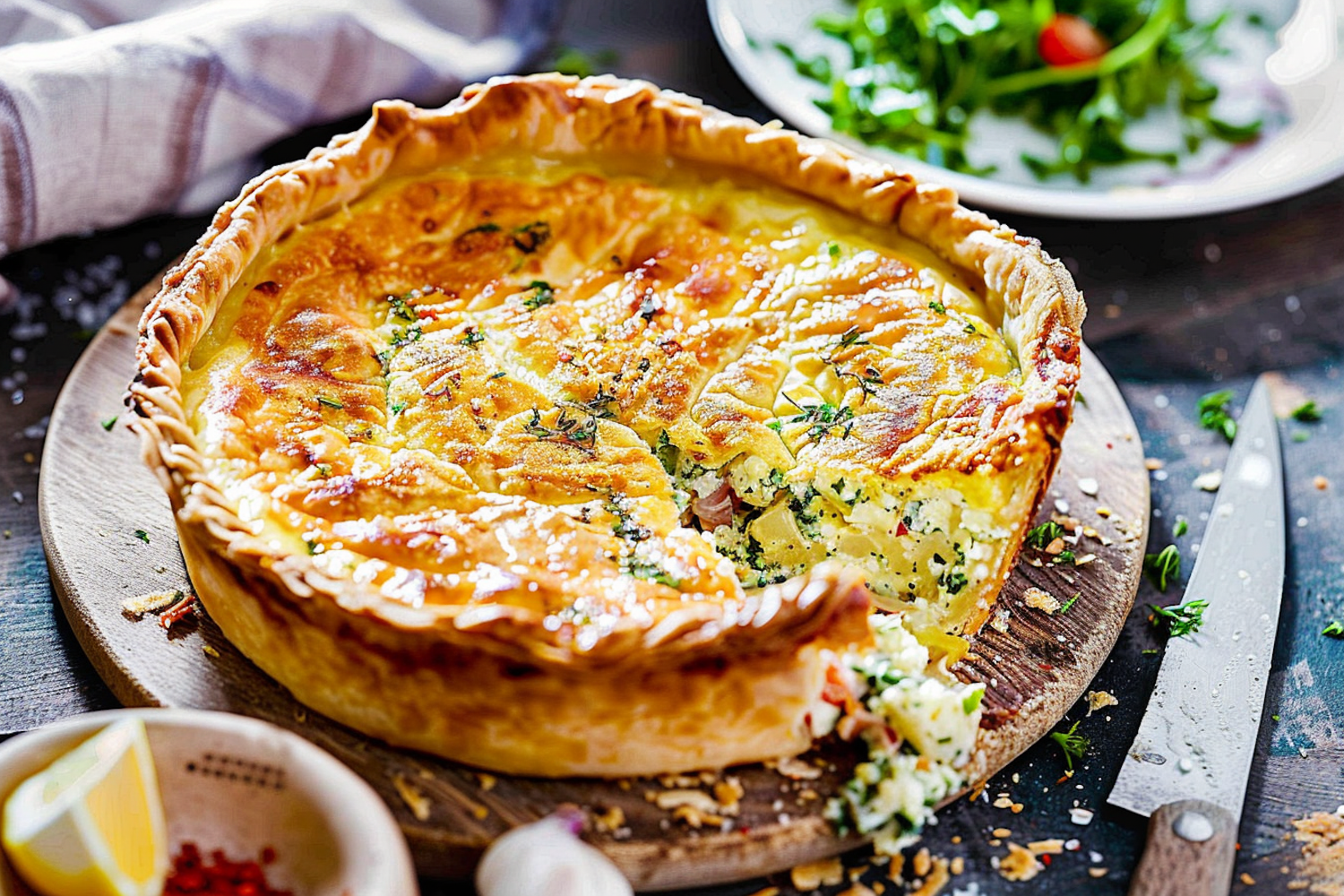 Golden-brown quiche with creamy filling and herbs on a wooden board, accompanied by a knife and fresh salad.
