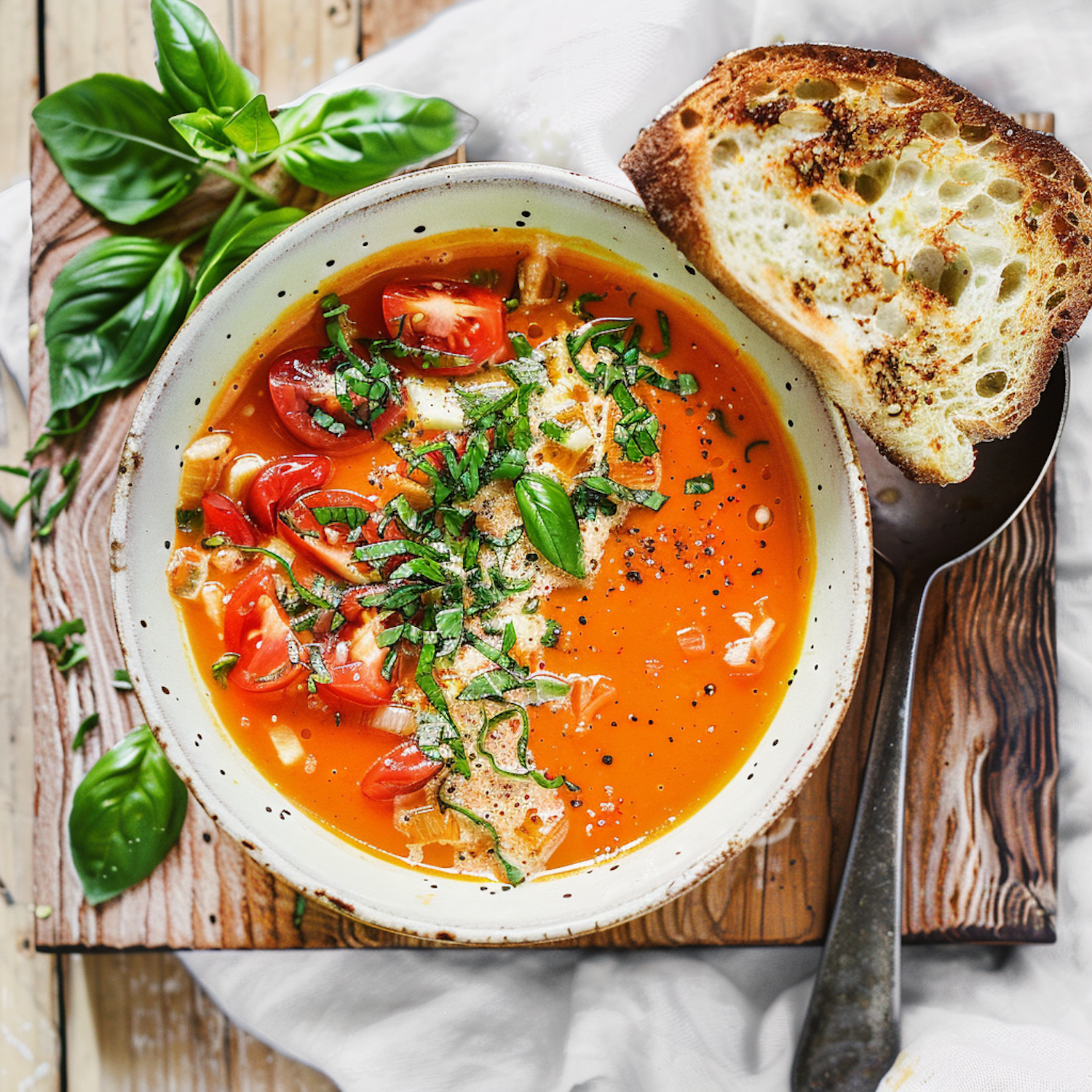 Vibrant tomato soup with fresh basil and cherry tomatoes, served with toasted bread on a rustic wooden surface.