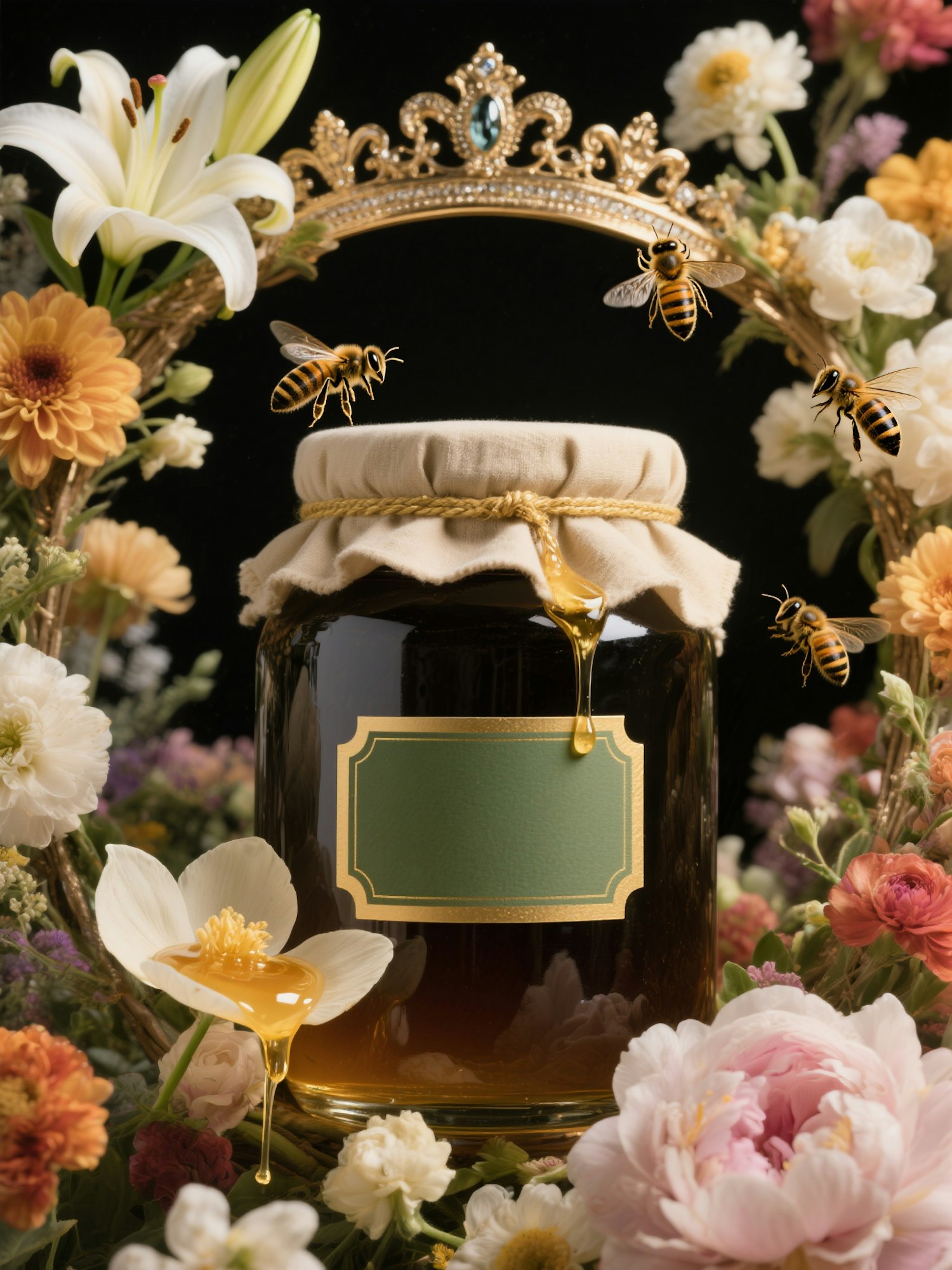 Studio photography with a chic, royal and elegant art direction. High contrast lighting, refined and sophisticated atmosphere, not overly bright, luxurious visual style. A dark glass honey jar (realistic size, beige fabric lid, golden string, rectangular blank label sage green or golden beige with golden border) is placed inside an ornate floral crown, woven from lilies, dahlias and peonies. Bees crawl gently over the flowers and fly around the crown. Honey drips slowly along one flower petal. The background is fully covered in flowers, edge to edge, no black visible. A symbolic, regal composition evoking the crown jewels of Versailles.
