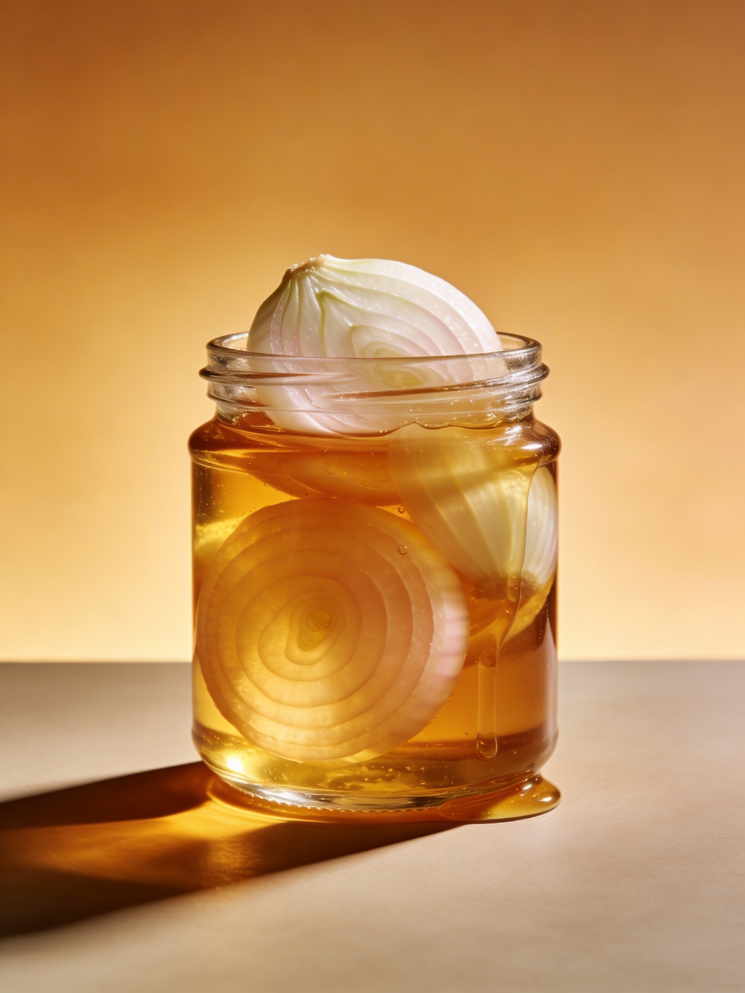 A jar of golden honey with onion slices, beautifully lit against a warm gradient background, showcasing natural textures and colors.