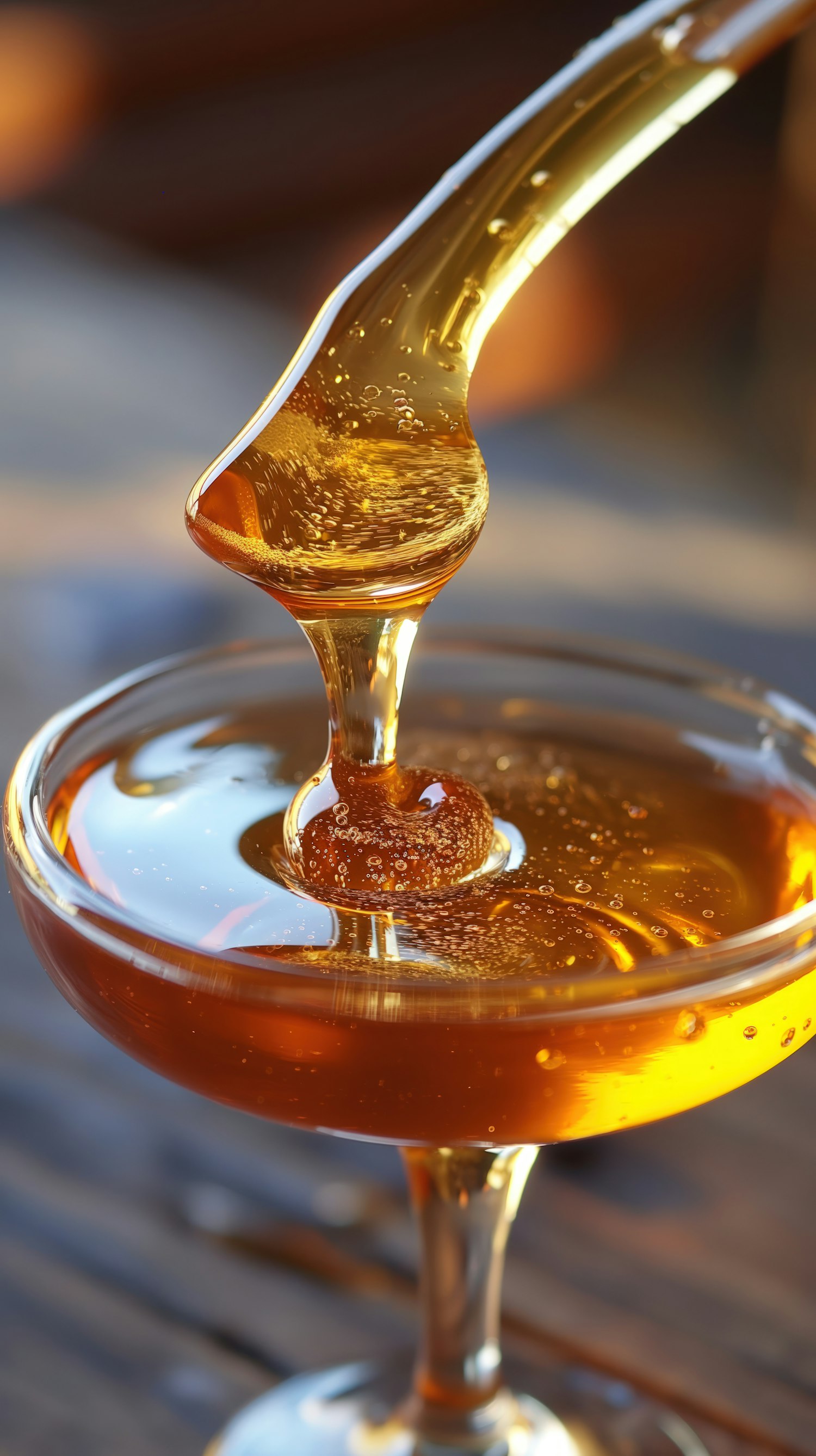 Golden honey flowing from a spoon into a glass dish, capturing its rich texture and amber hue in a warm, inviting scene.