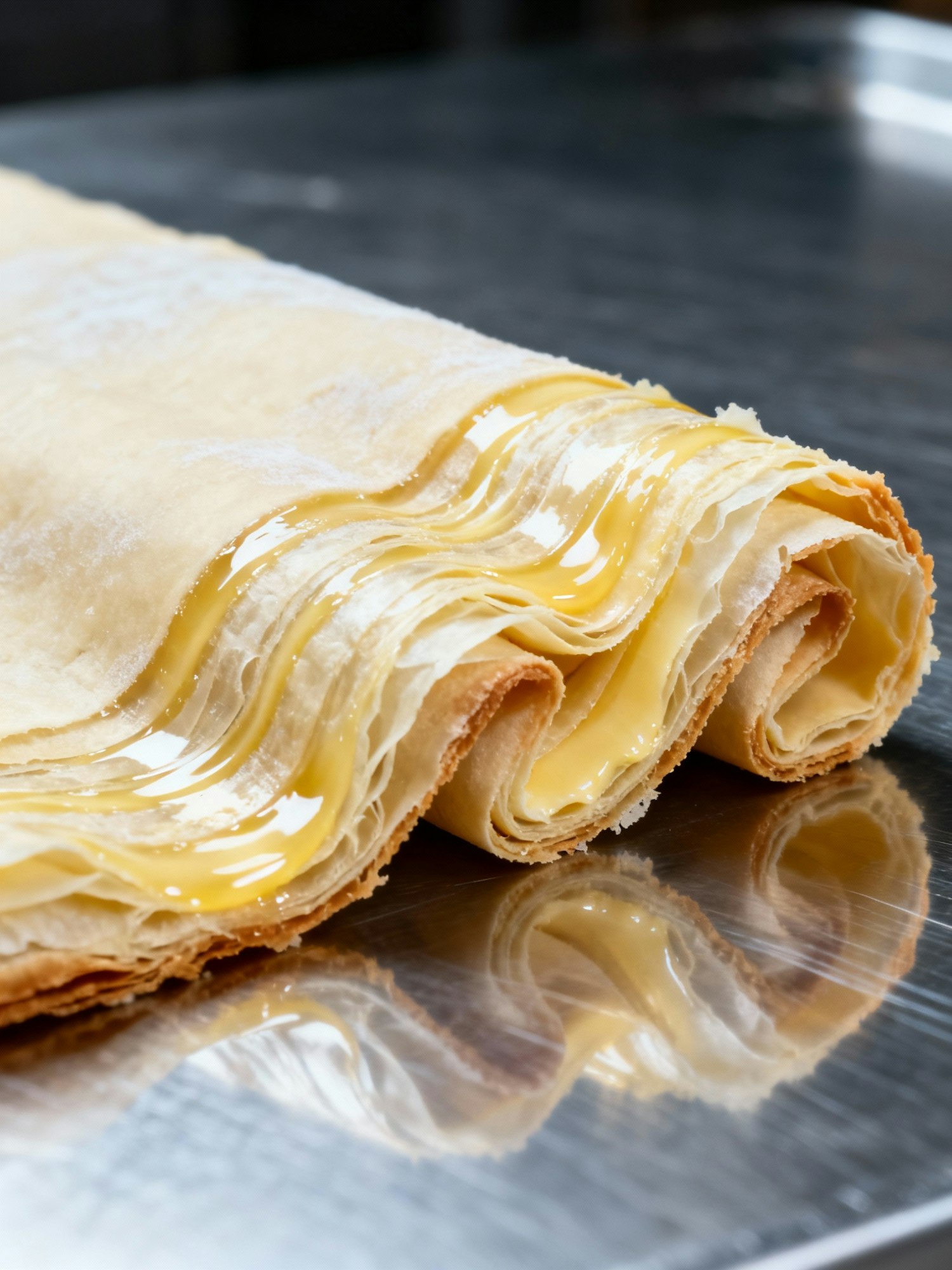 A macro editorial close-up of laminated pastry dough being folded with meticulous precision — layers thin as silk, infused with glossy ribbons of butter that catch every glimmer of light. The edges are crisp, the folds perfectly aligned, each reflecting the cool silver hue of the workspace beneath. The lighting is high contrast, defining every ridge and ripple with cinematic sharpness. The atmosphere evokes patience and mastery — an ode to the art of pastry-making captured in its most luxurious detail.