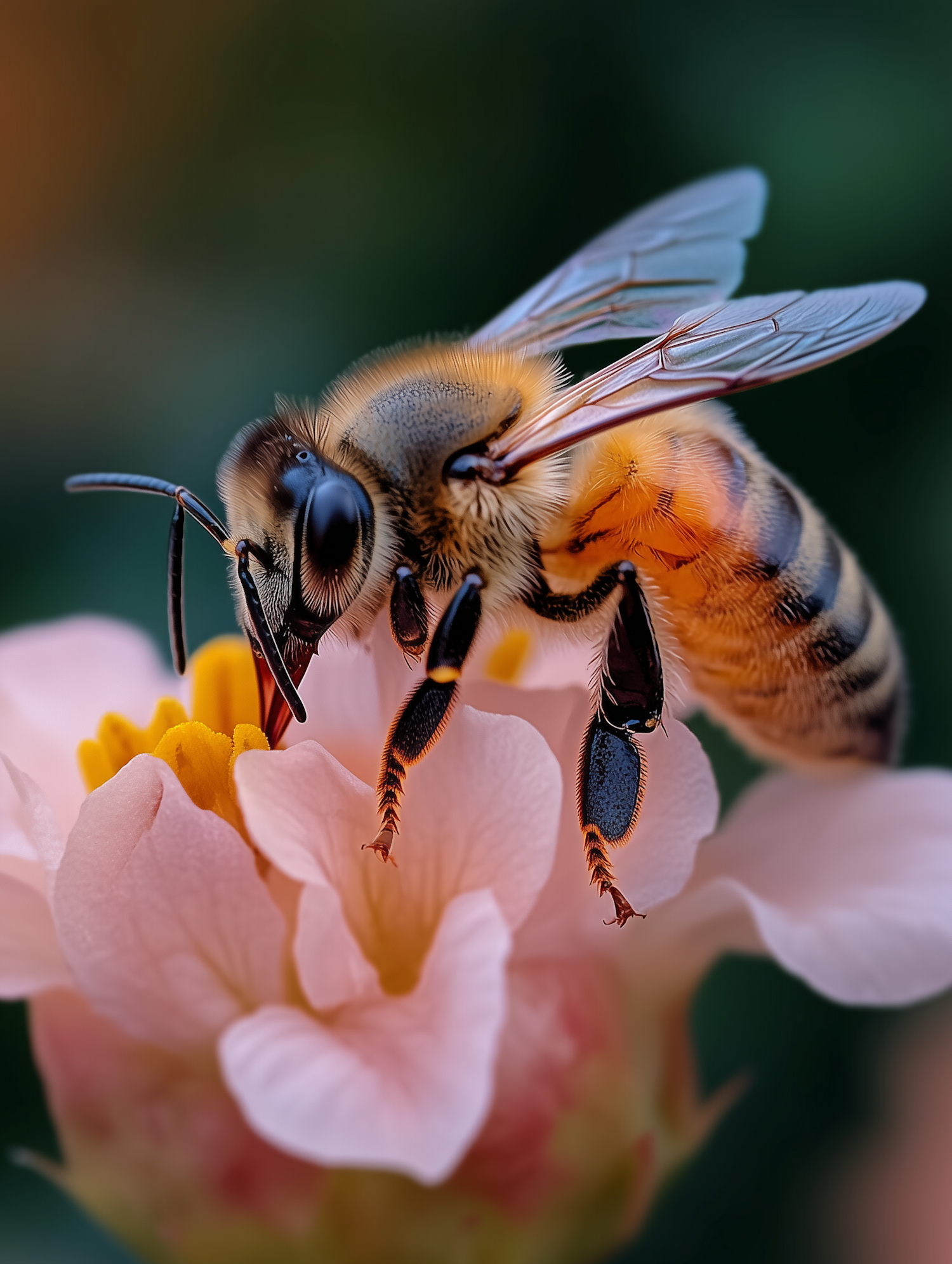 A stunning macro shot of a honeybee collecting nectar from a delicate pink flower, showcasing intricate details of the bee and petals.