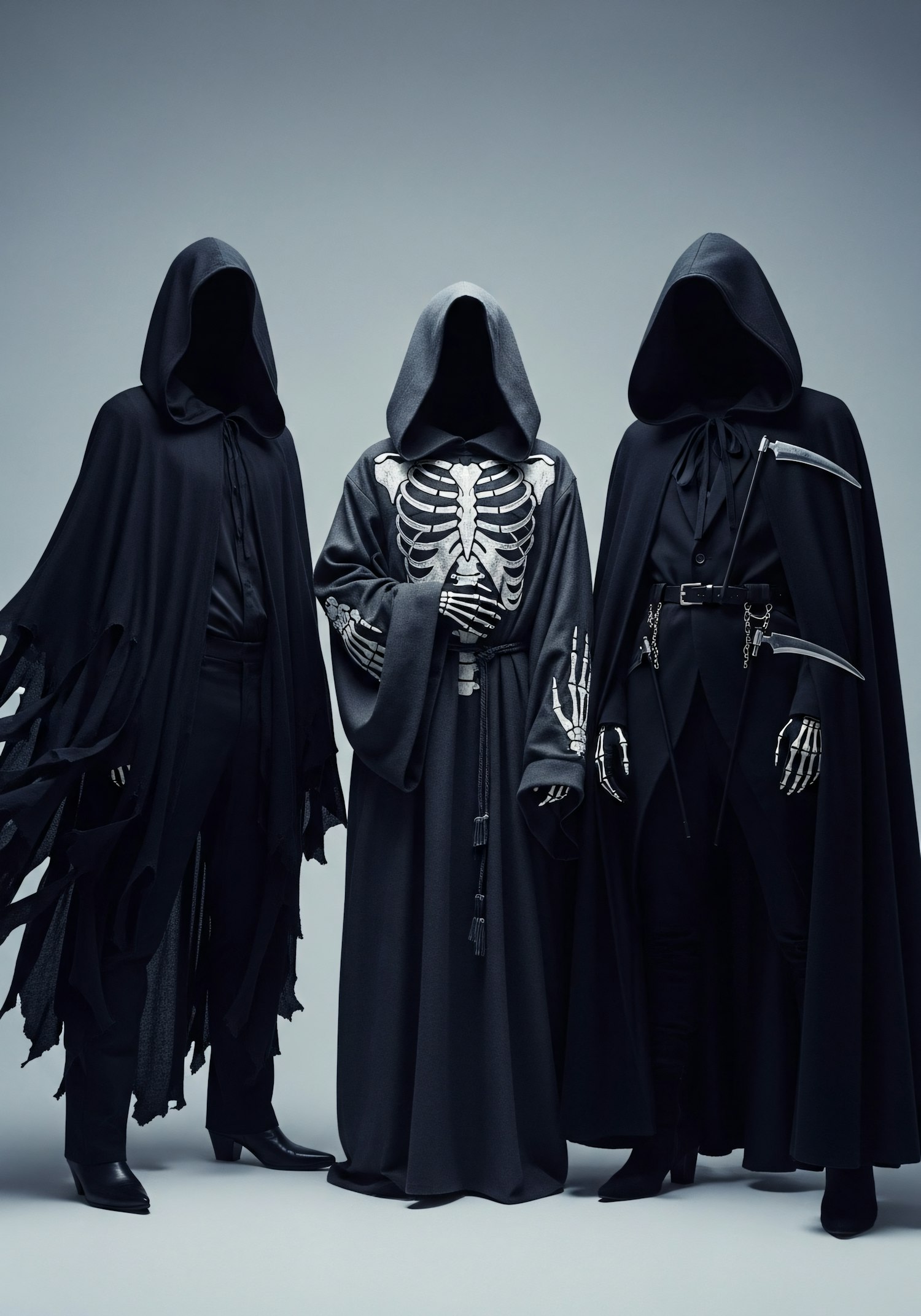 Three hooded figures in dark cloaks, one with a skeletal design, stand in a mysterious and dramatic arrangement.