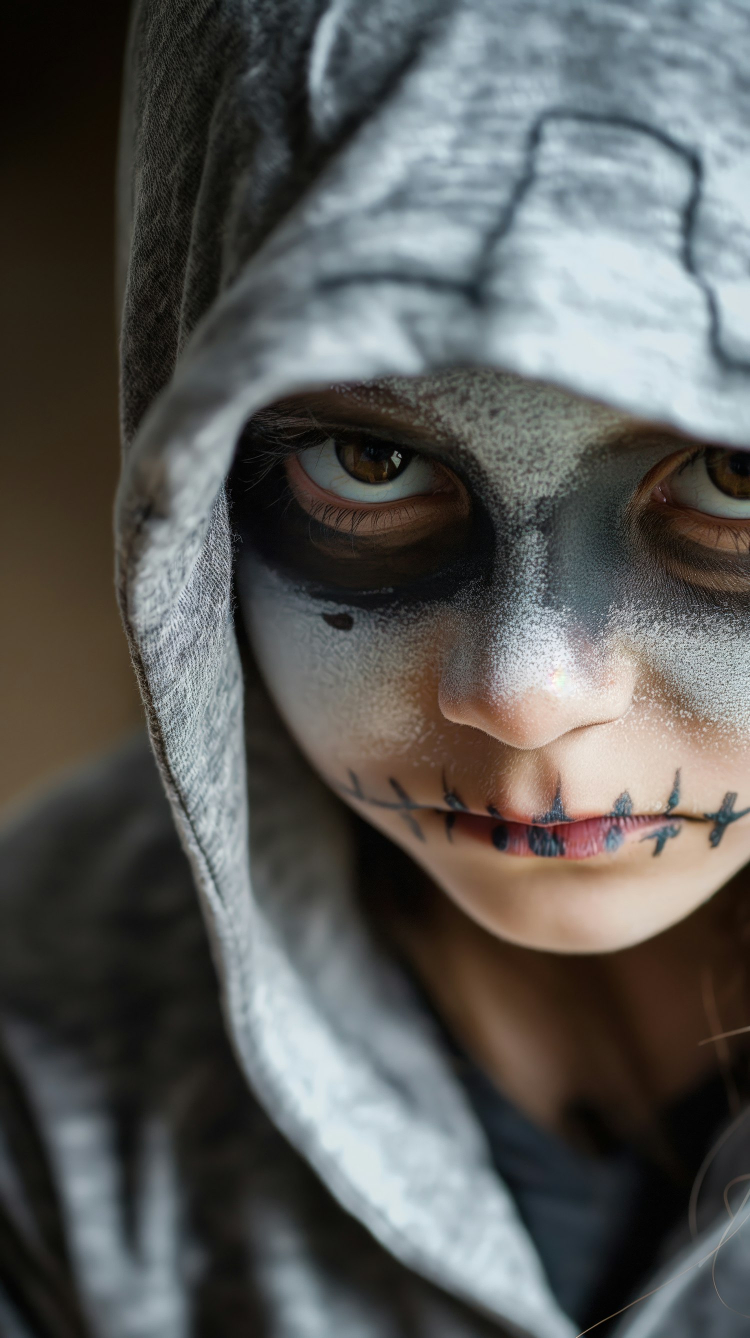 Close-up of a child with skull face paint and a gray hood, creating an eerie and intense atmosphere.