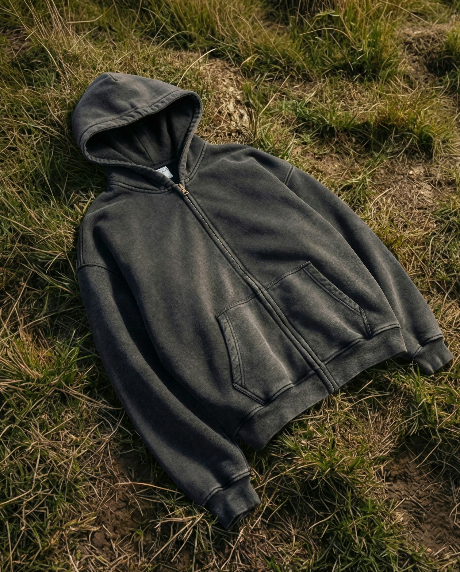 A dark gray hoodie with a zip-up front and pockets lies on a grassy field, showcasing its casual and comfortable design.