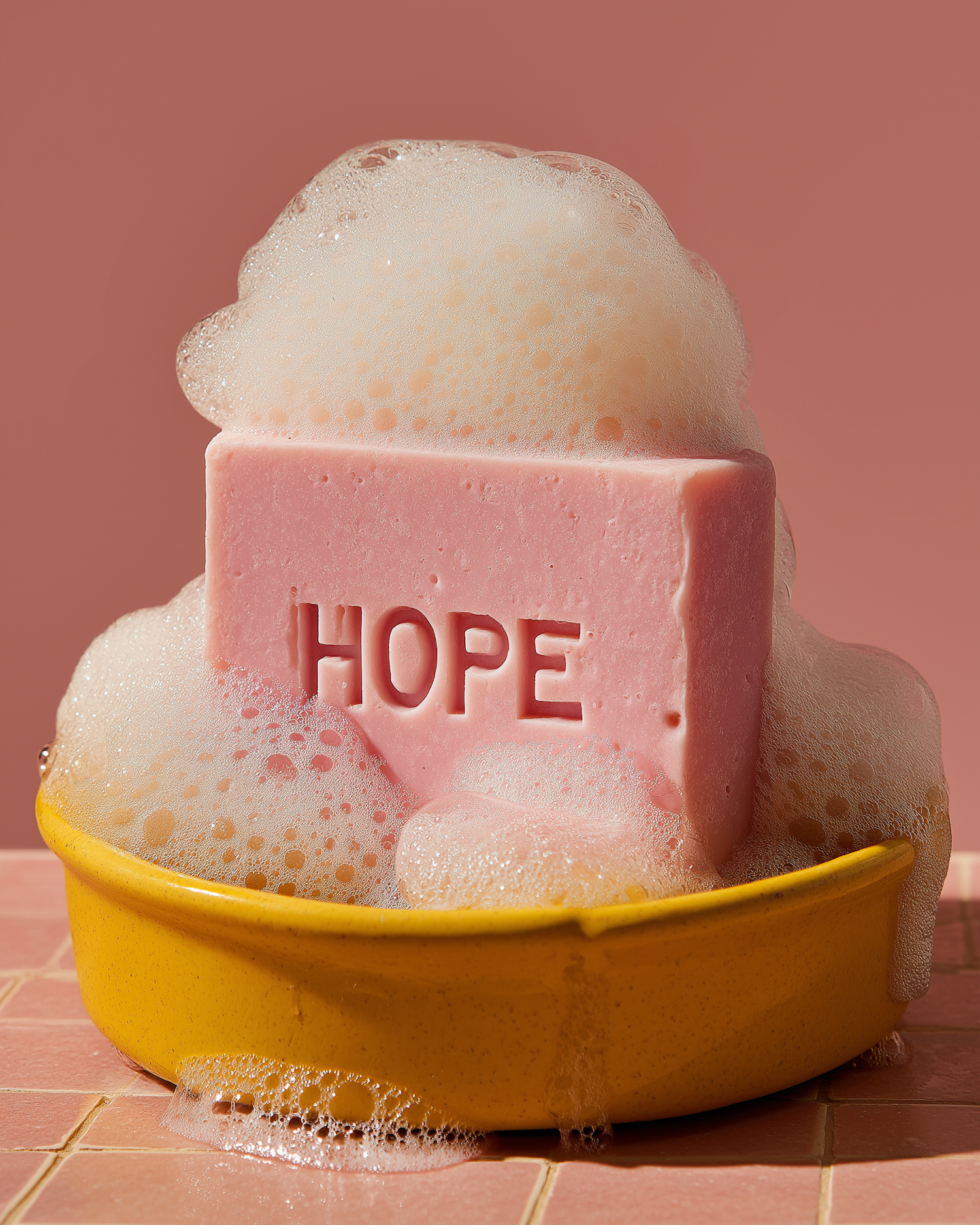 A pink soap bar with 'HOPE' engraved, surrounded by frothy bubbles in a yellow dish, set against a muted pink background.