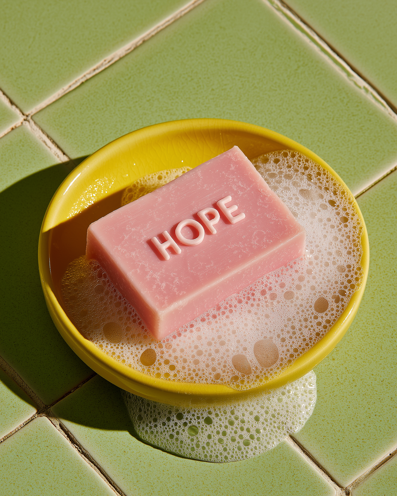 A pink soap bar with 'HOPE' embossed, resting in a yellow dish on green tiles, surrounded by frothy bubbles in bright lighting.