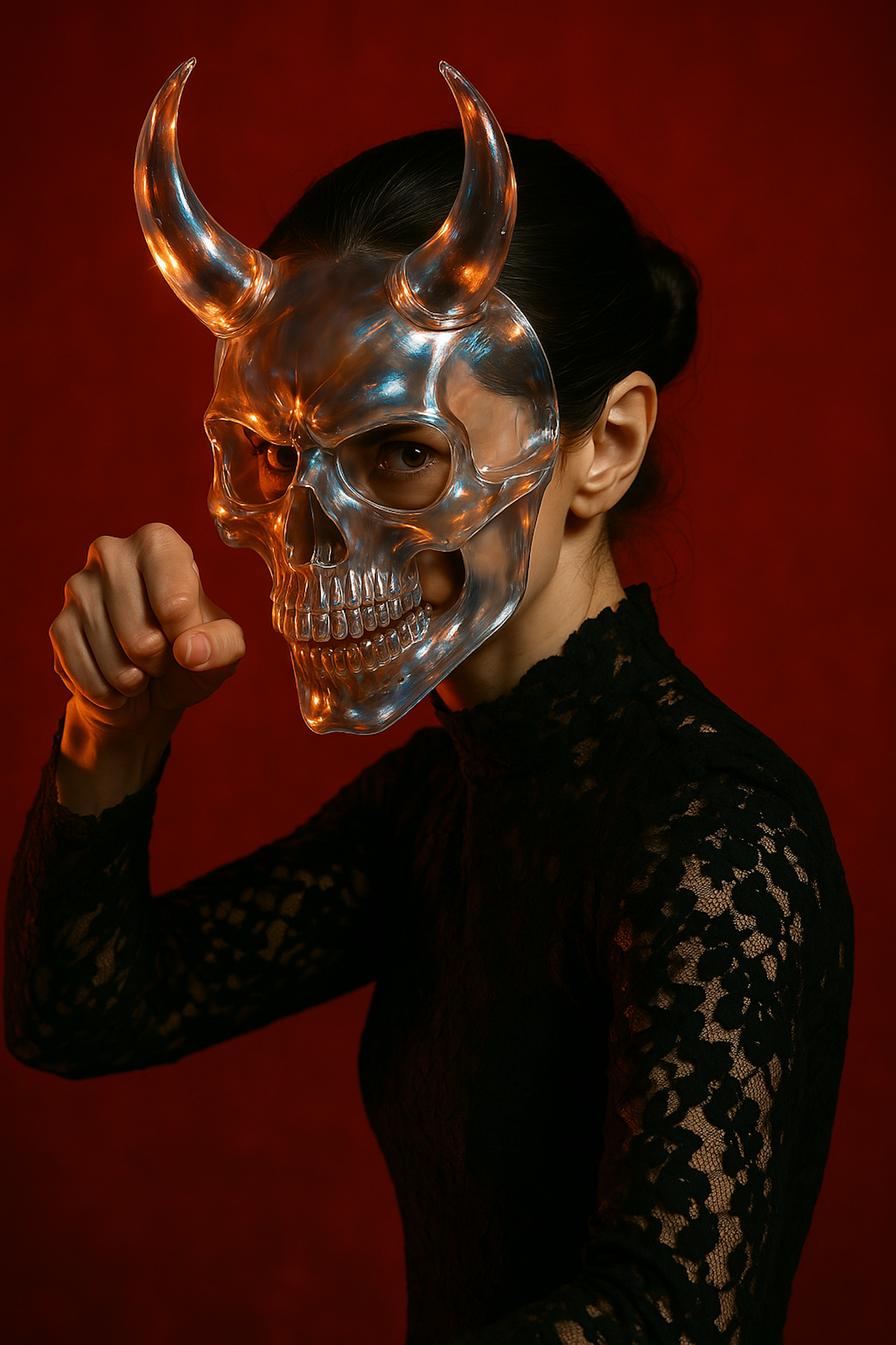 A person in a translucent horned skull mask and black lace outfit points dramatically against a deep red background.