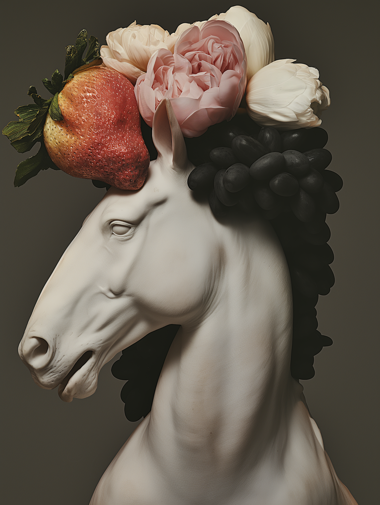Surreal horse sculpture adorned with fruits and flowers, featuring a strawberry, peonies, and grapes against a dark green background.
