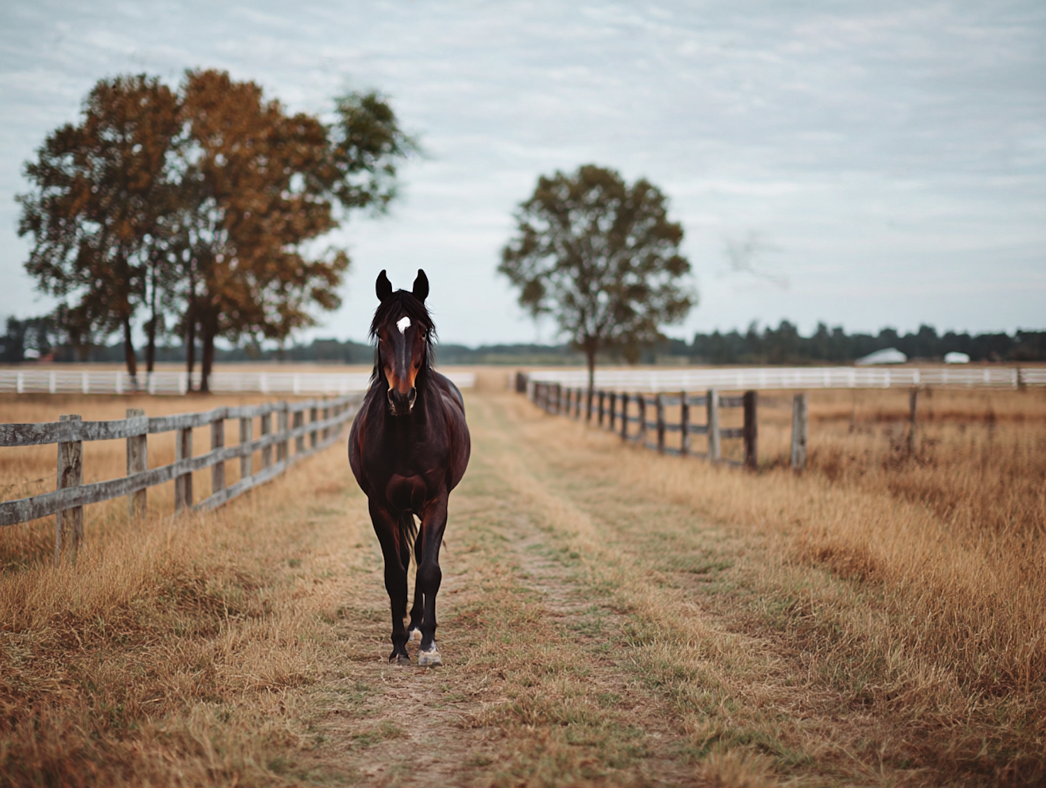 A dark brown horse with a white star marking walks on a dirt path in a golden field, surrounded by wooden fences and autumn trees.