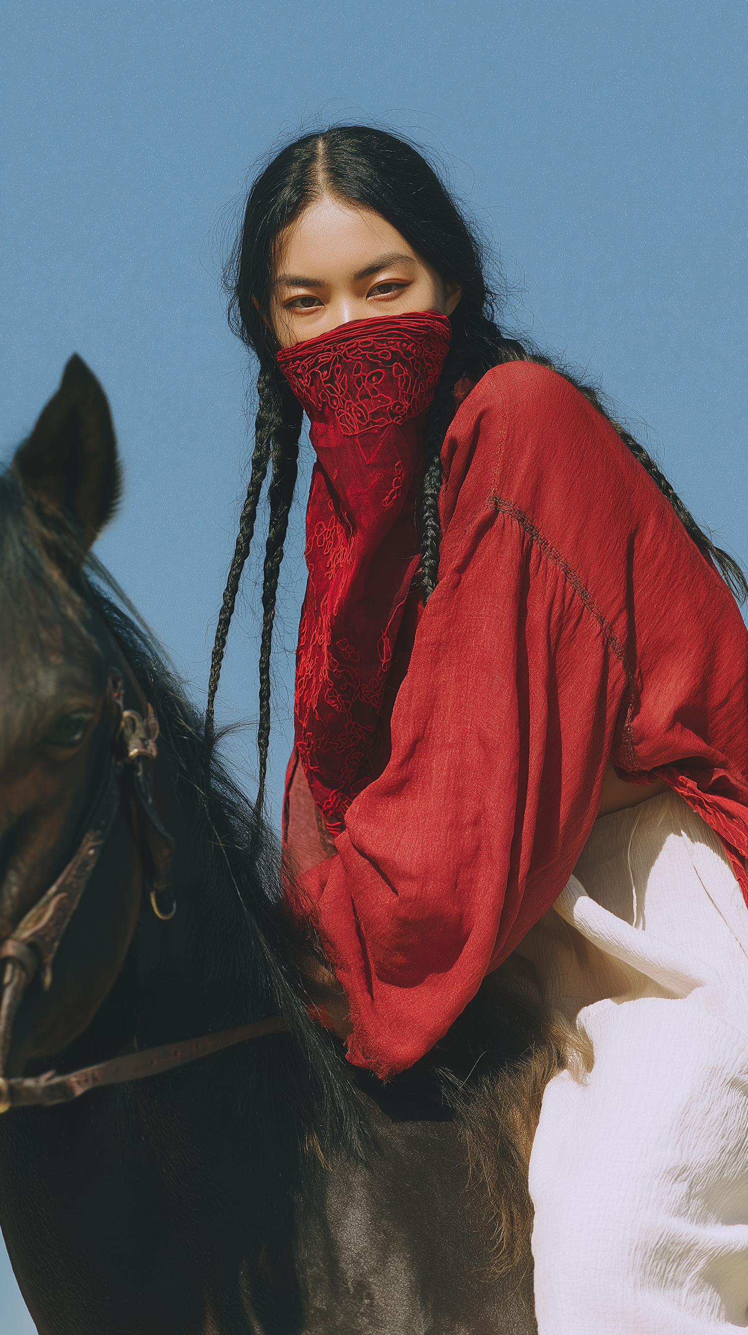 A person in vibrant red attire and long braids riding a black horse under a clear blue sky, evoking a sense of freedom and tradition.