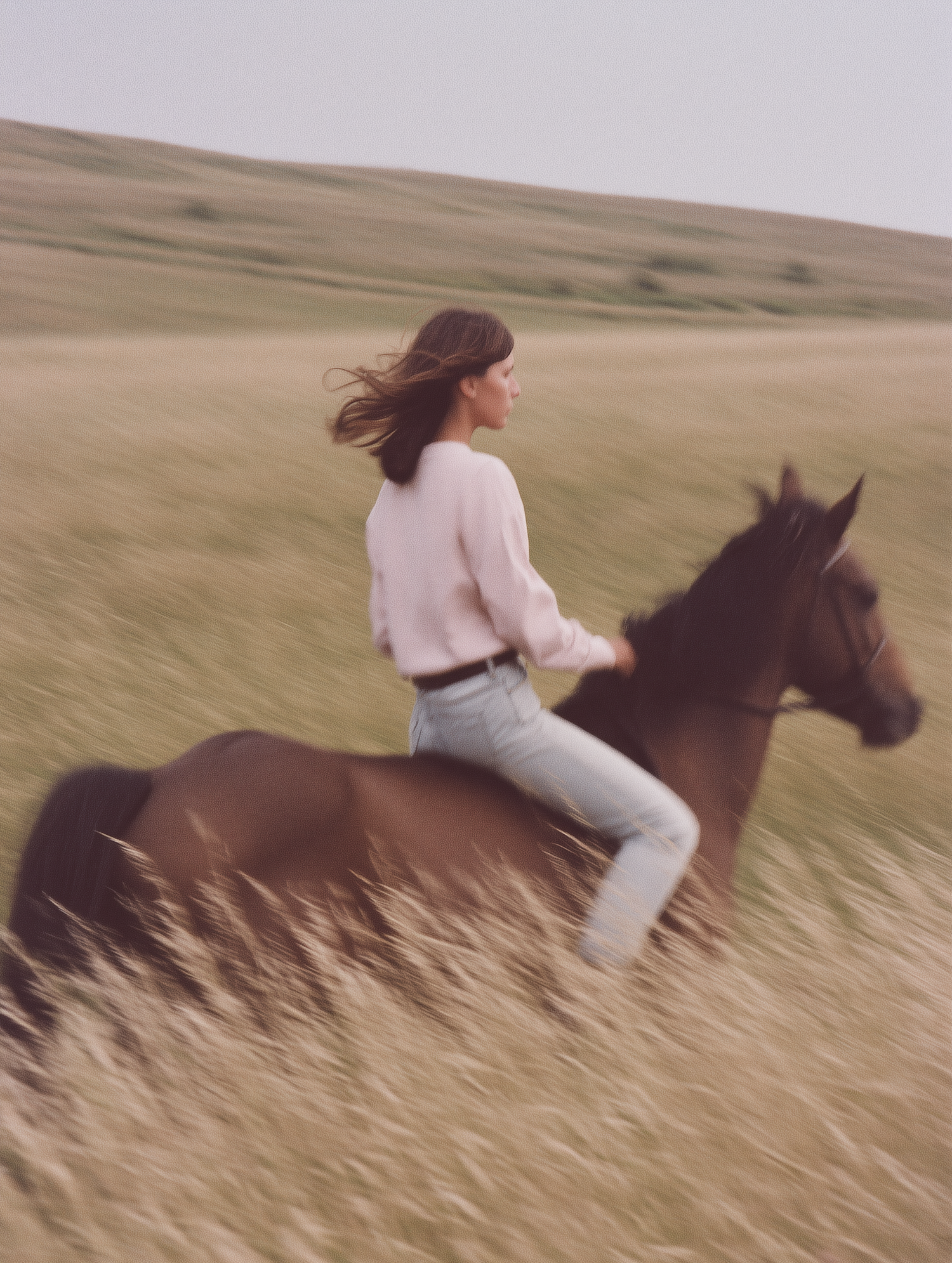A woman riding a horse through a golden field, her hair flowing in the wind, creating a serene and dynamic scene.