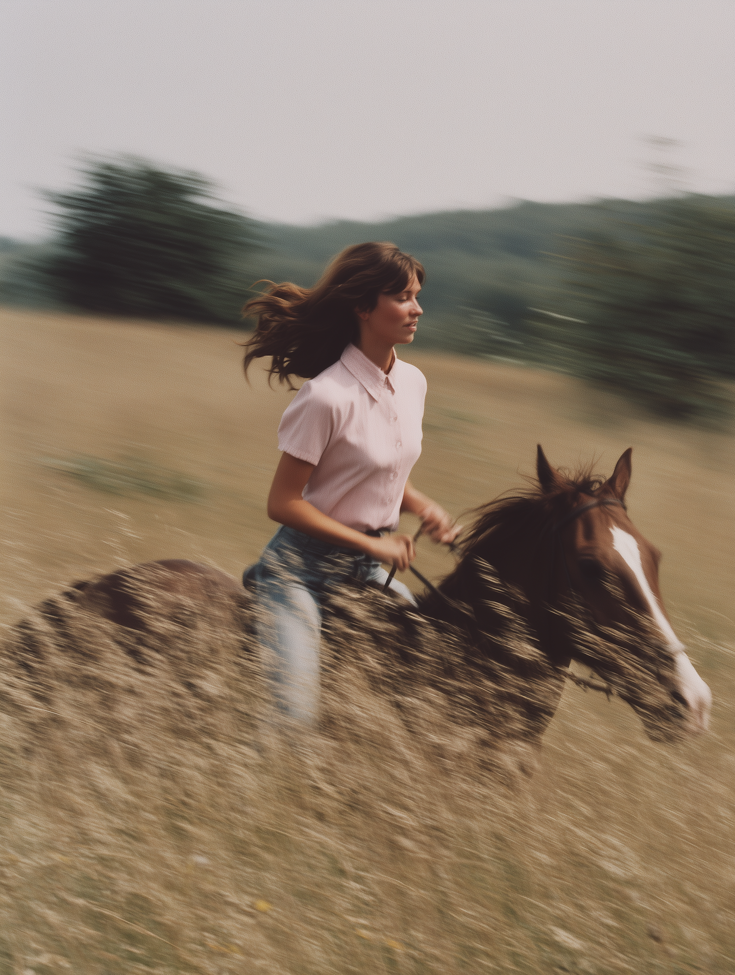 A young woman riding a chestnut horse through a grassy field, her hair flowing in the wind, creating a dynamic and serene scene.