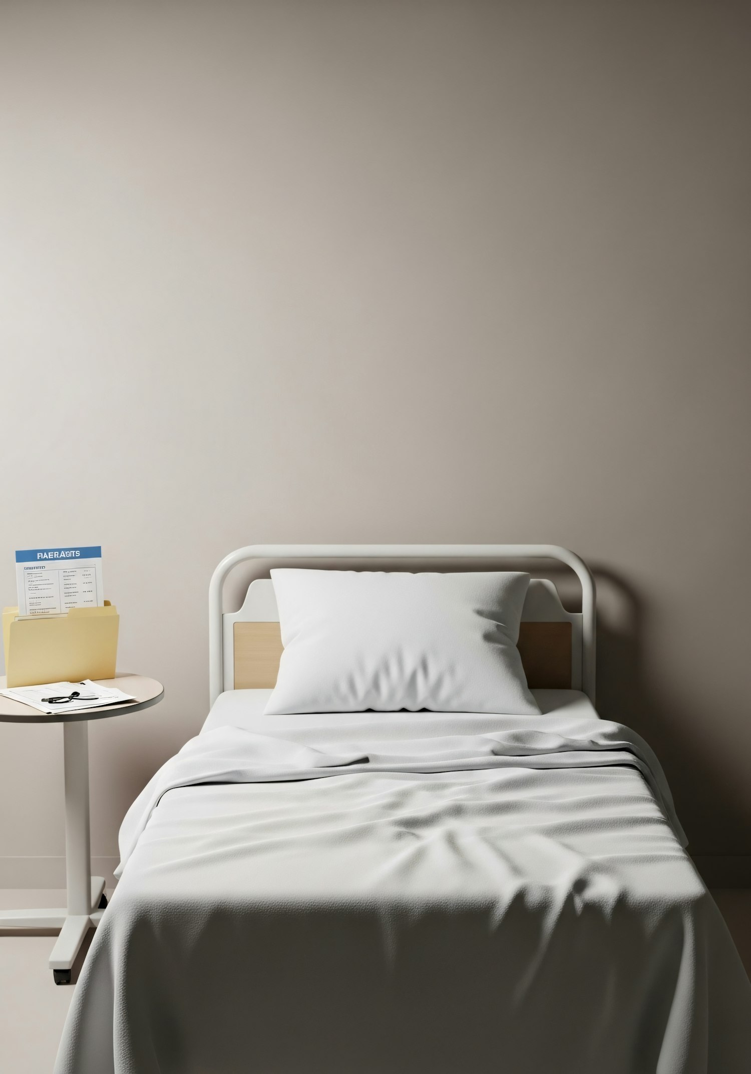 A hospital bed with white linens and a bedside table holding a folder and glasses, set in a minimalistic and clean environment.