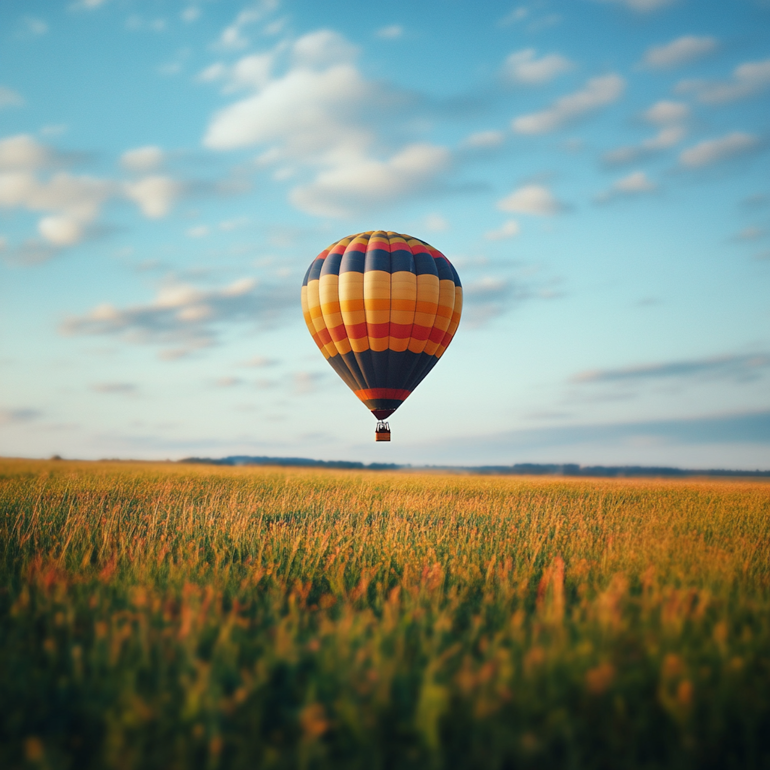 Colorful hot air balloon soaring over a golden field under a clear blue sky with scattered clouds.