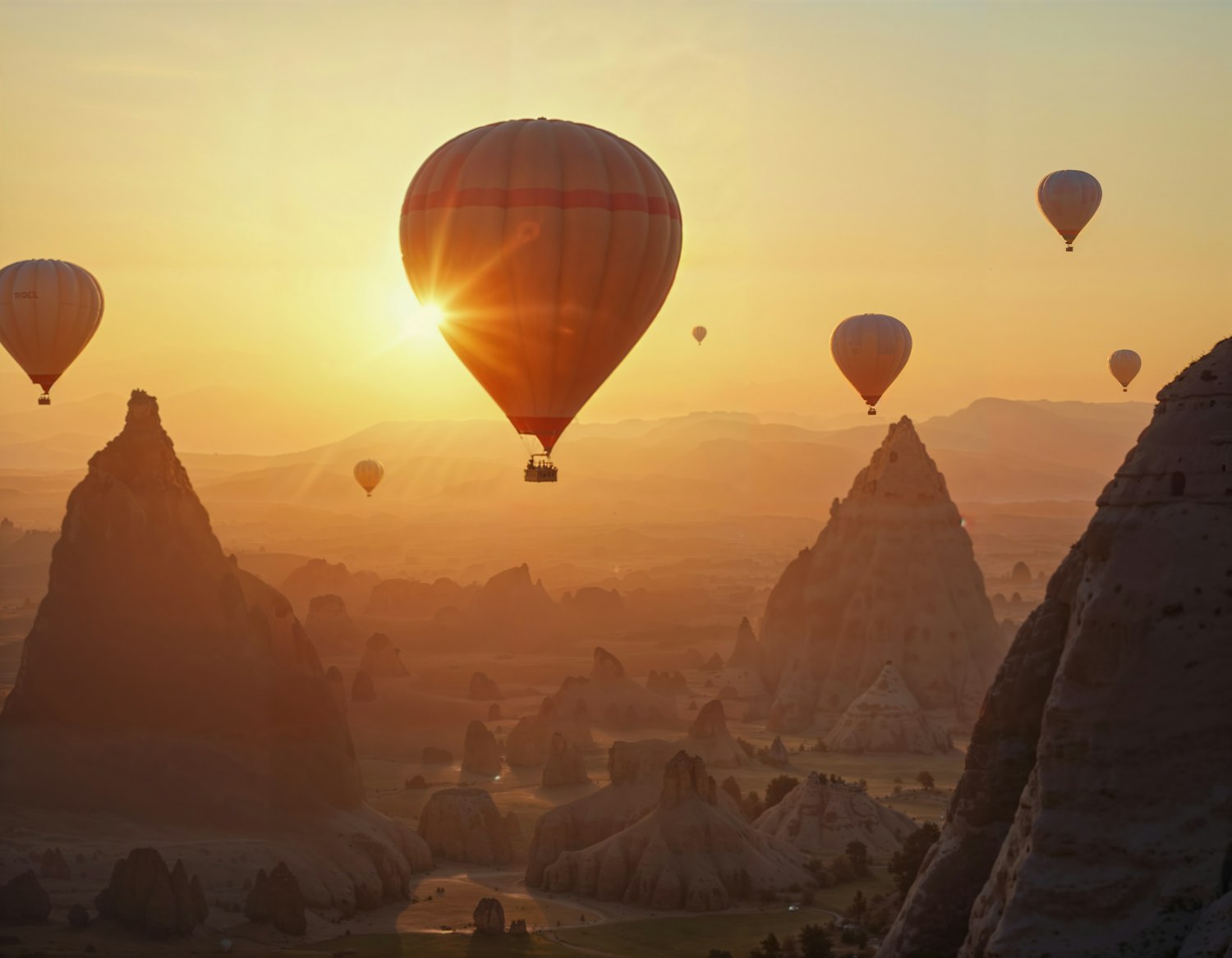 Hot air balloons soar over a stunning landscape at sunrise, with warm hues and unique rock formations creating a serene scene.
