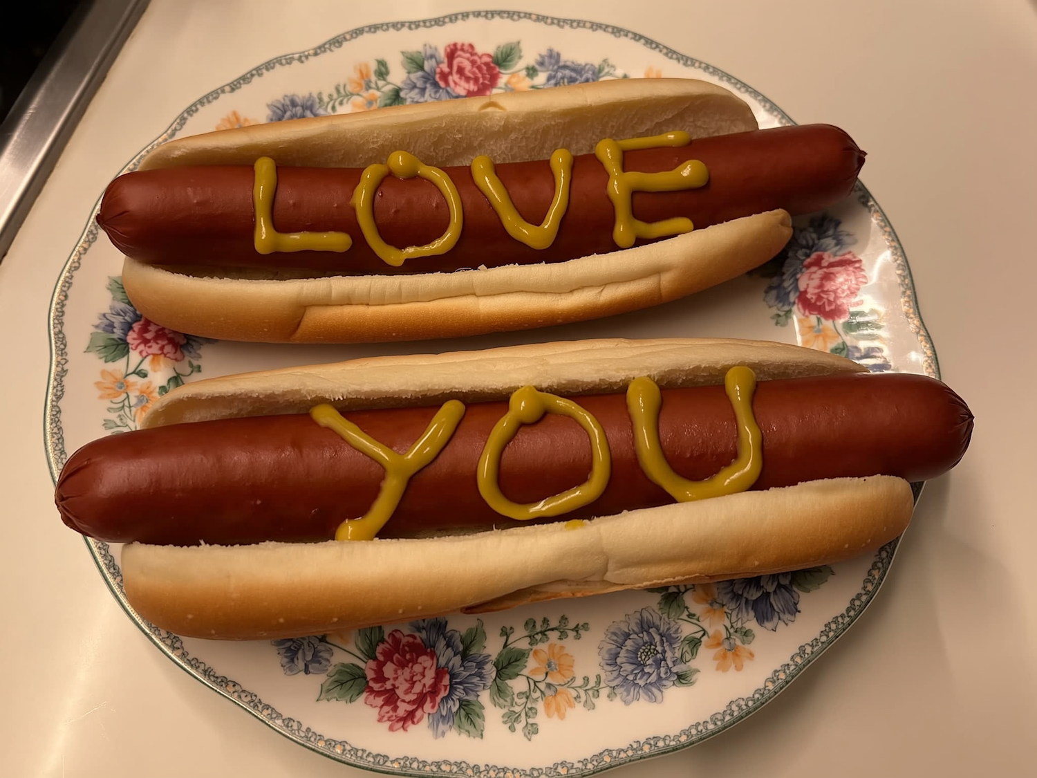 Two hot dogs with 'LOVE' and 'YOU' written in mustard on a floral plate, creating a fun and heartfelt food presentation.