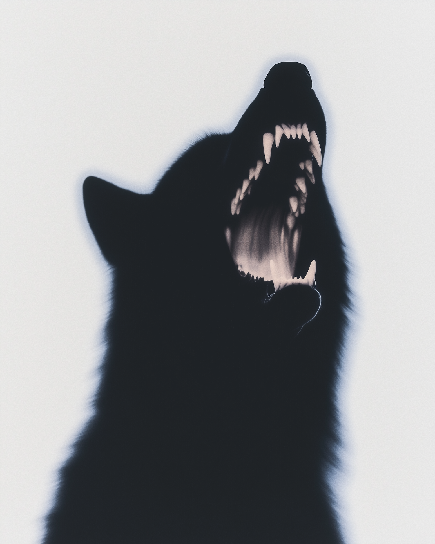 Silhouette of a howling wolf with sharp teeth visible, set against a pale gradient background. A striking and primal depiction of nature.