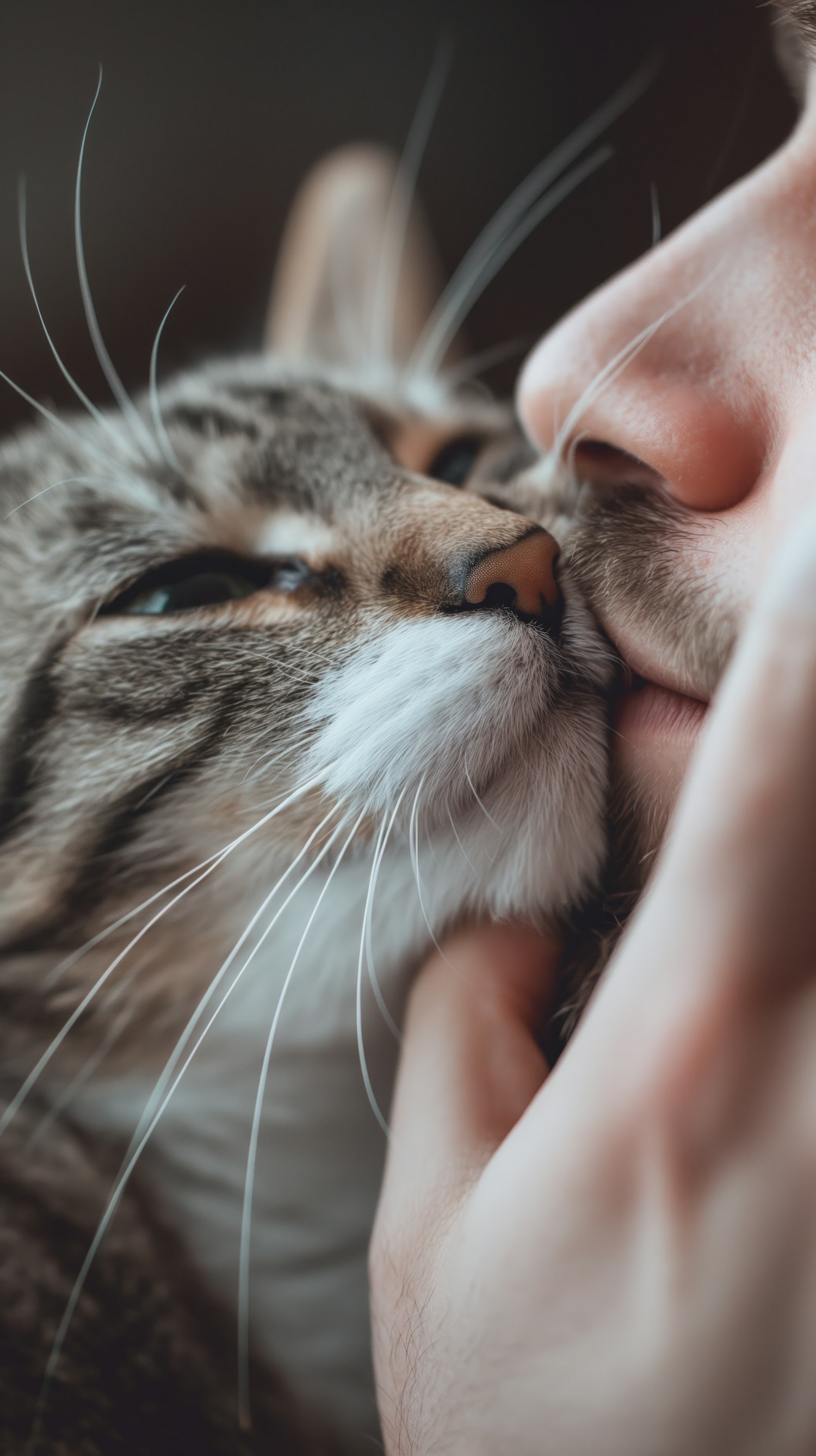 Close-up of a cat nuzzling a person's face, showcasing a tender bond and mutual affection in a serene, intimate moment.