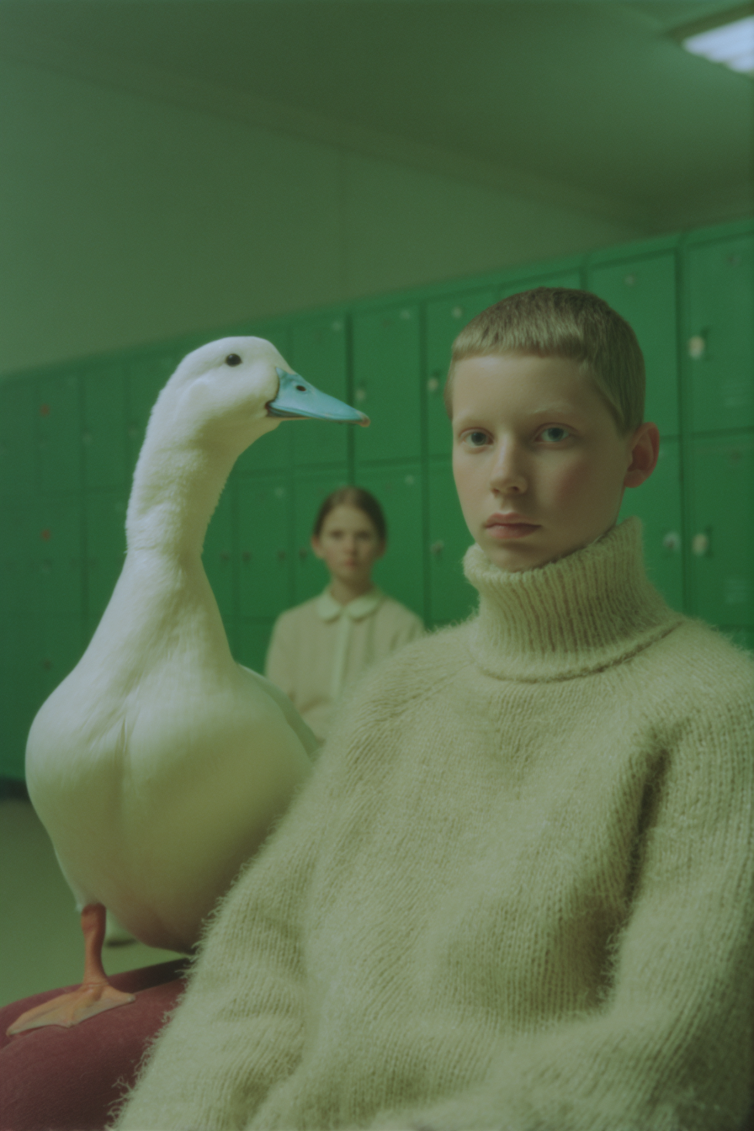A young person in a soft knit sweater sits near a duck, set against green lockers, creating a unique blend of human and animal charm.