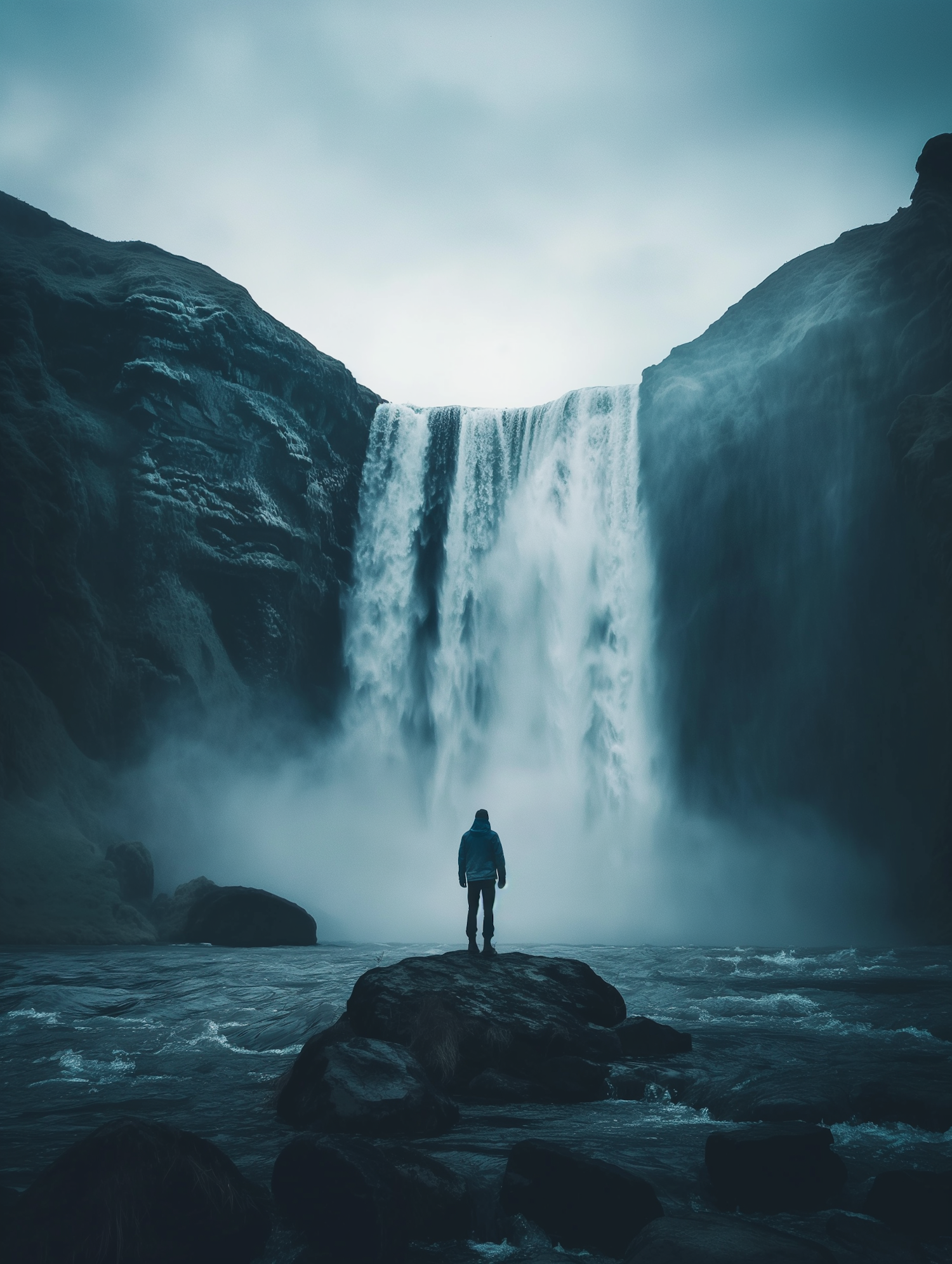 A person in a blue jacket stands on a rock before a majestic waterfall, surrounded by mist and rugged cliffs.