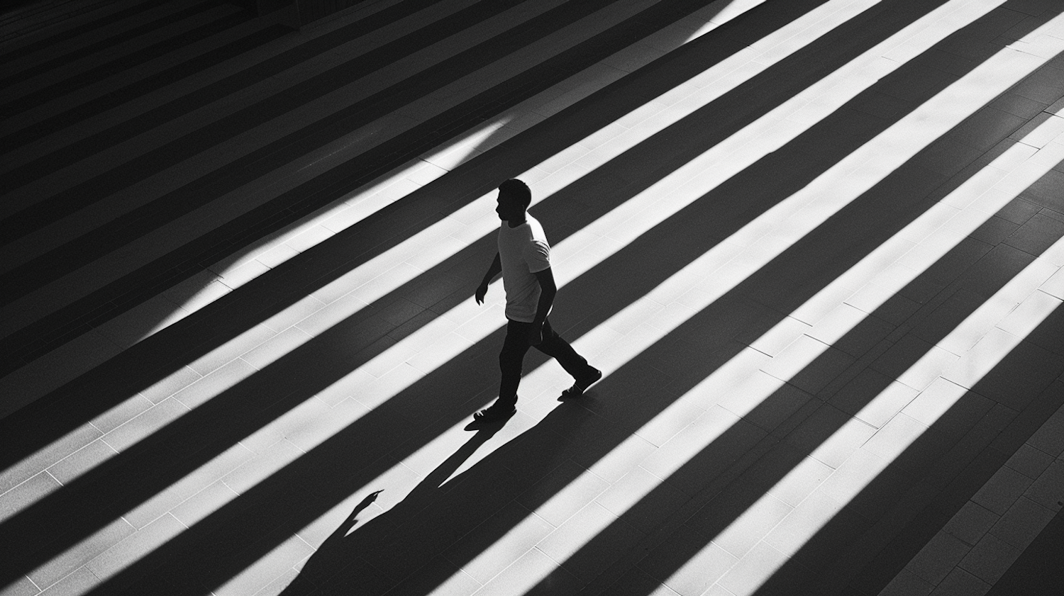 Black and white photo of a man walking through dramatic light and shadow patterns on a tiled floor.
