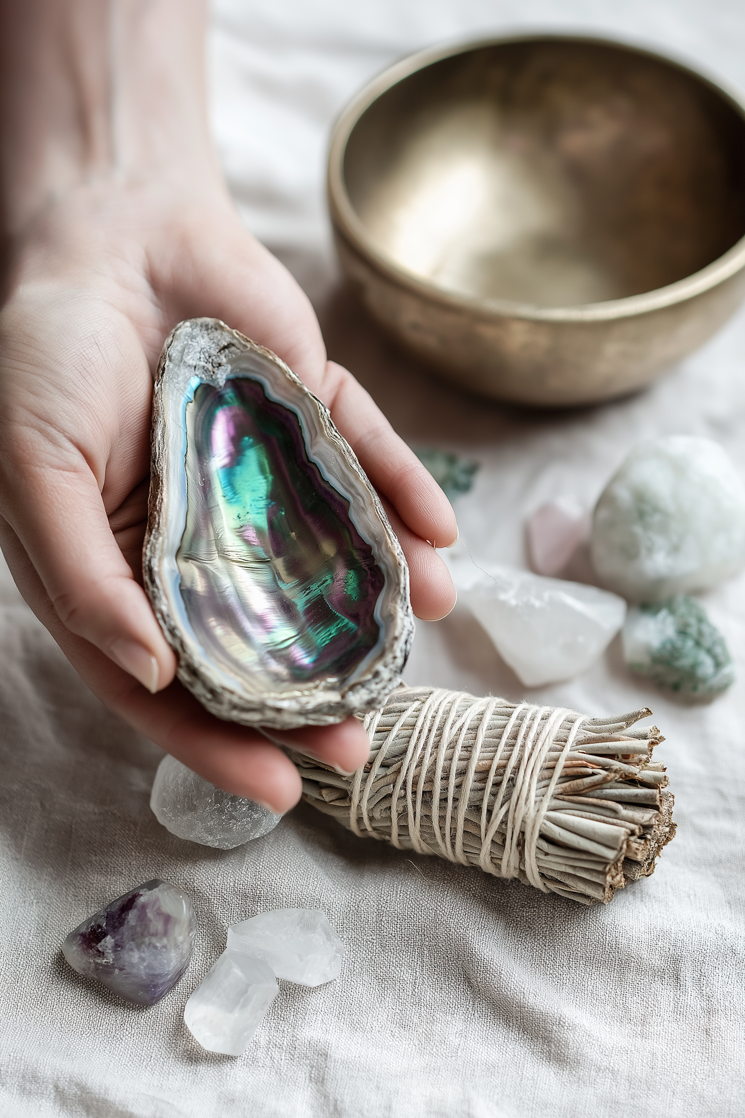 Hand holding an iridescent abalone shell with crystals, sage, and a brass singing bowl on a soft fabric background.