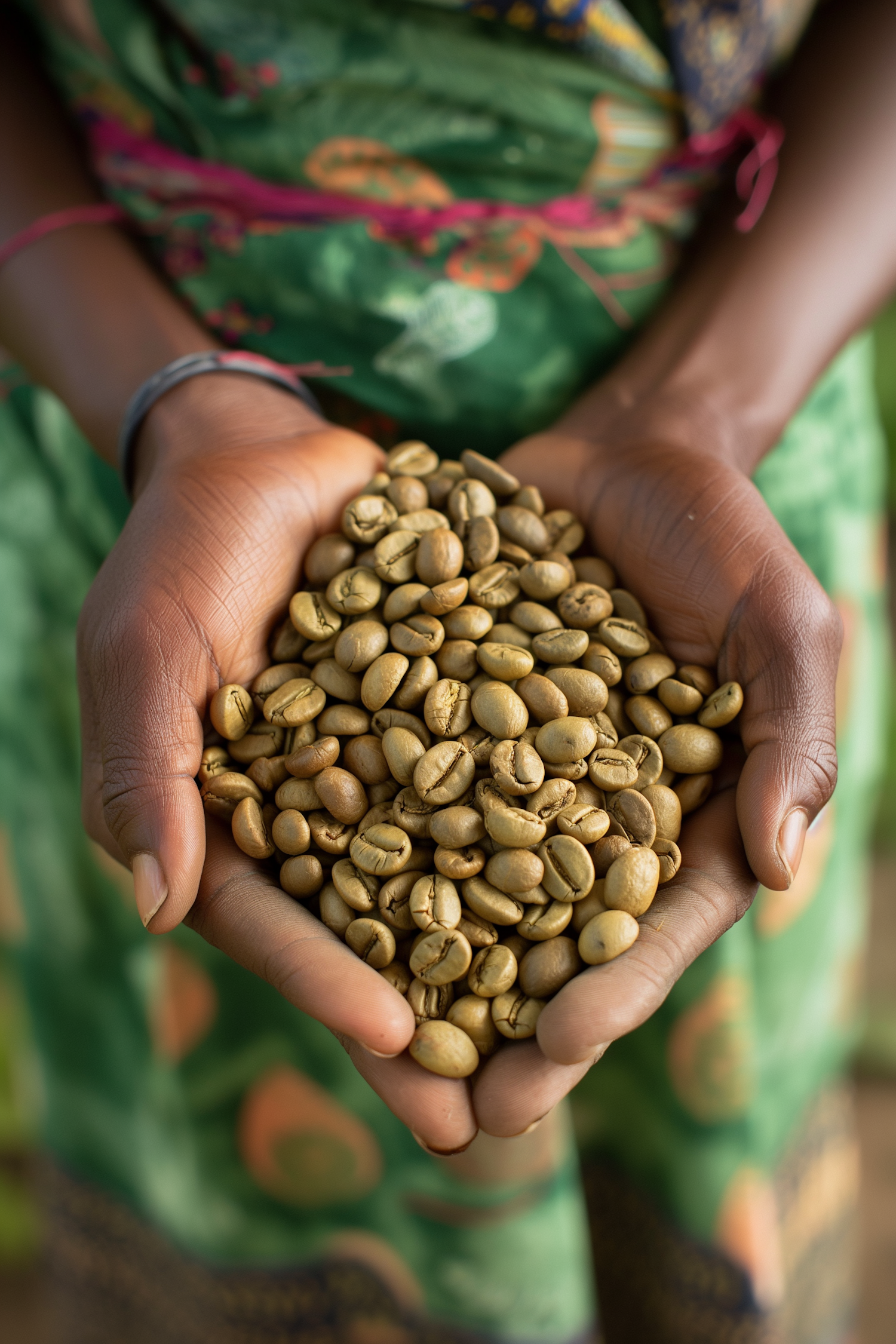 Hands holding a mound of unroasted coffee beans against a colorful, patterned background.