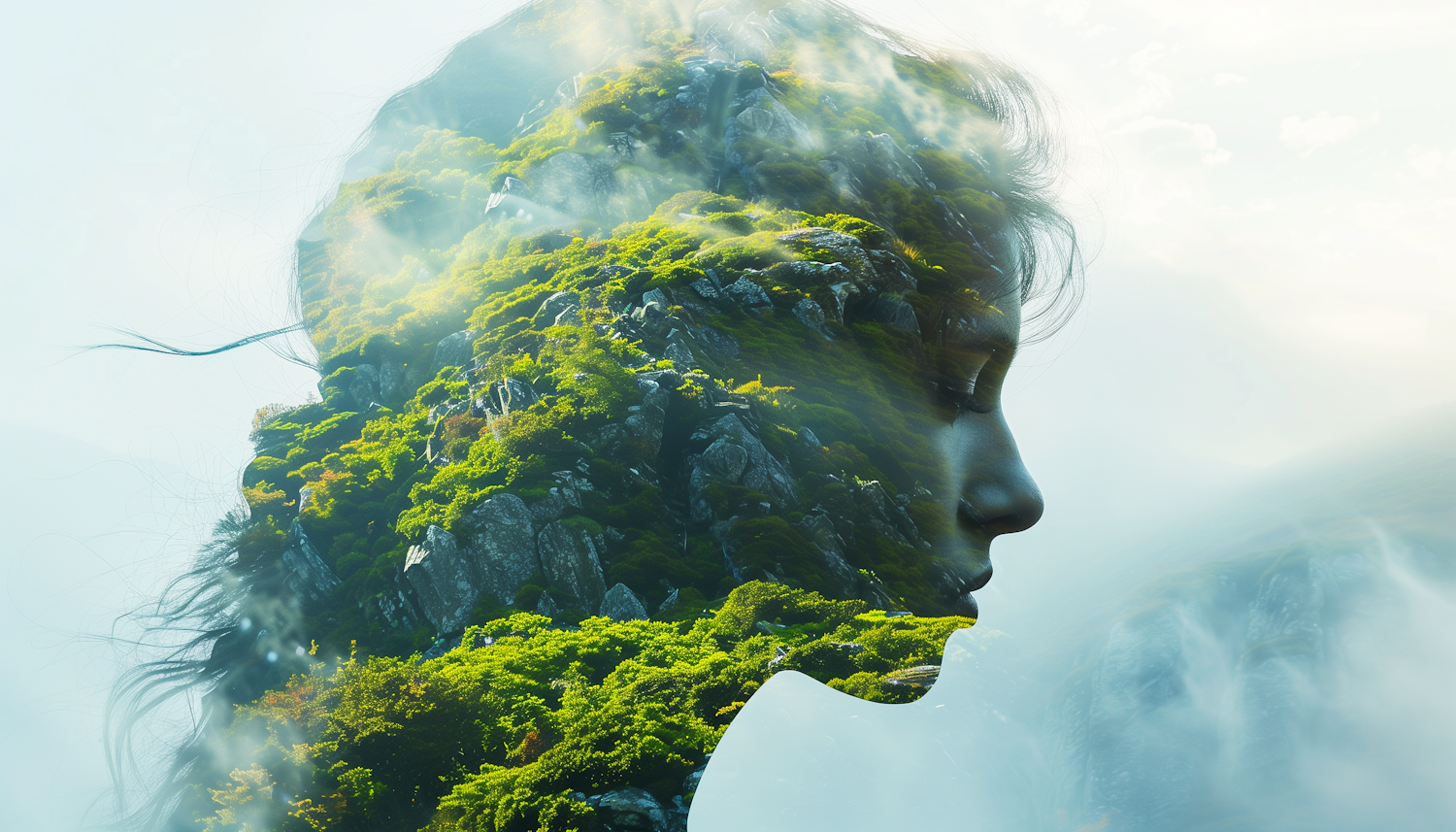 Double exposure of a woman's profile blended with a lush green mountain landscape, creating a serene nature-human connection.