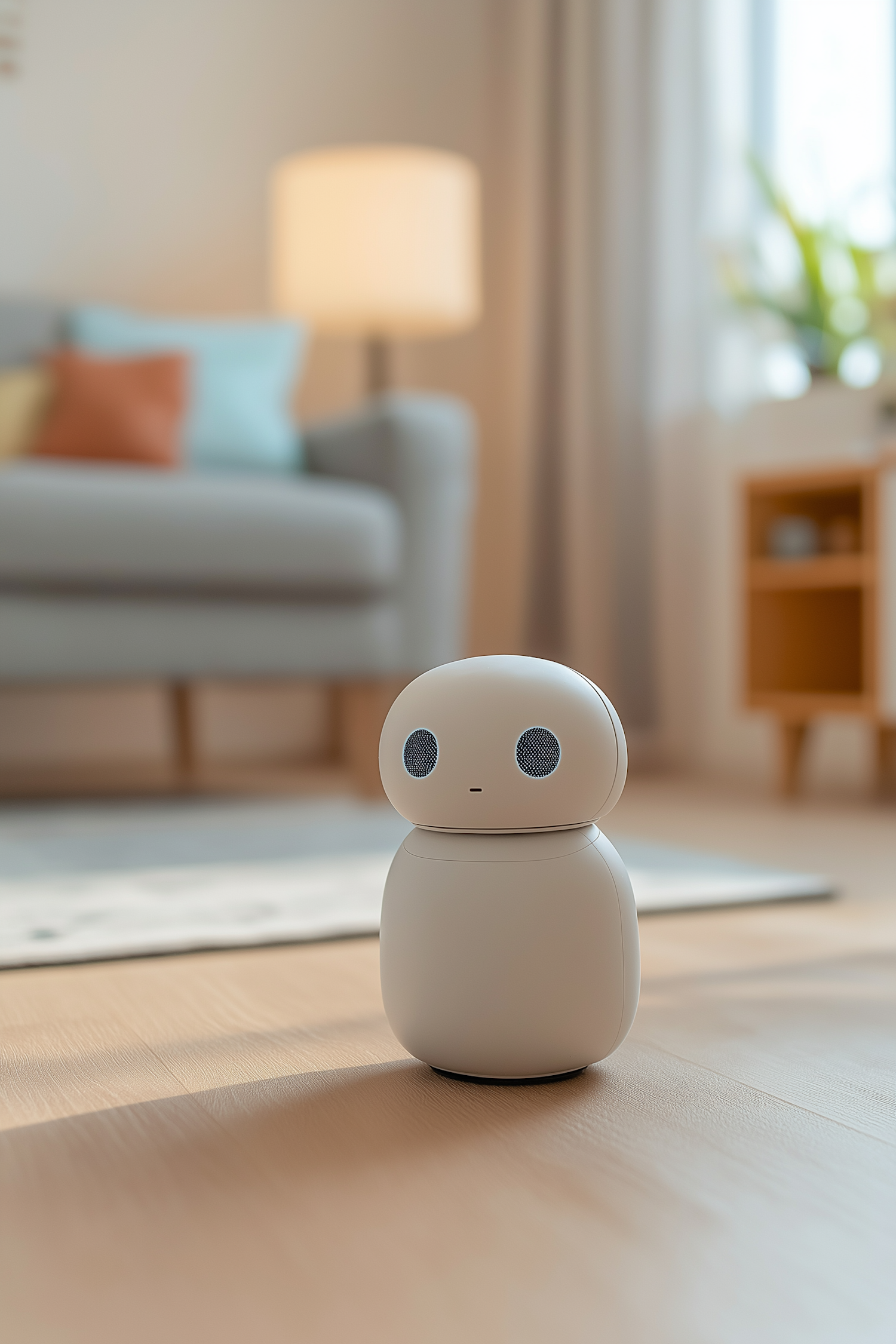 Adorable white robot in a cozy living room with colorful cushions and warm lighting, creating a serene and inviting atmosphere.