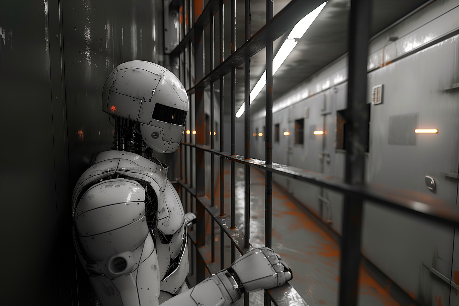A futuristic robot stands behind bars in a dimly lit corridor, evoking themes of confinement and contemplation.
