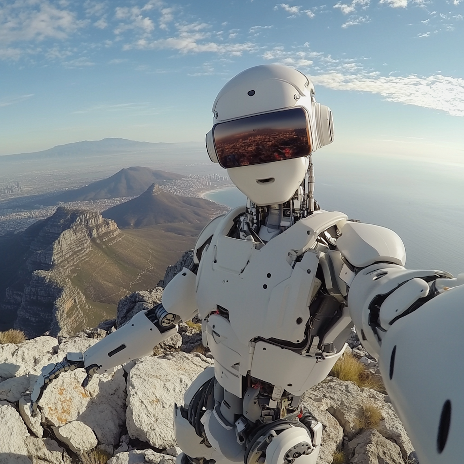 Humanoid robot takes a selfie on a mountain peak, showcasing a stunning landscape with mountains and sea under a clear sky.