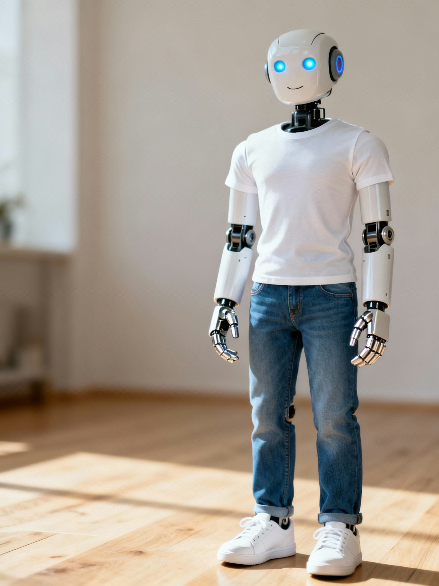 A humanoid robot in casual attire stands in a bright room, blending futuristic design with everyday human fashion.