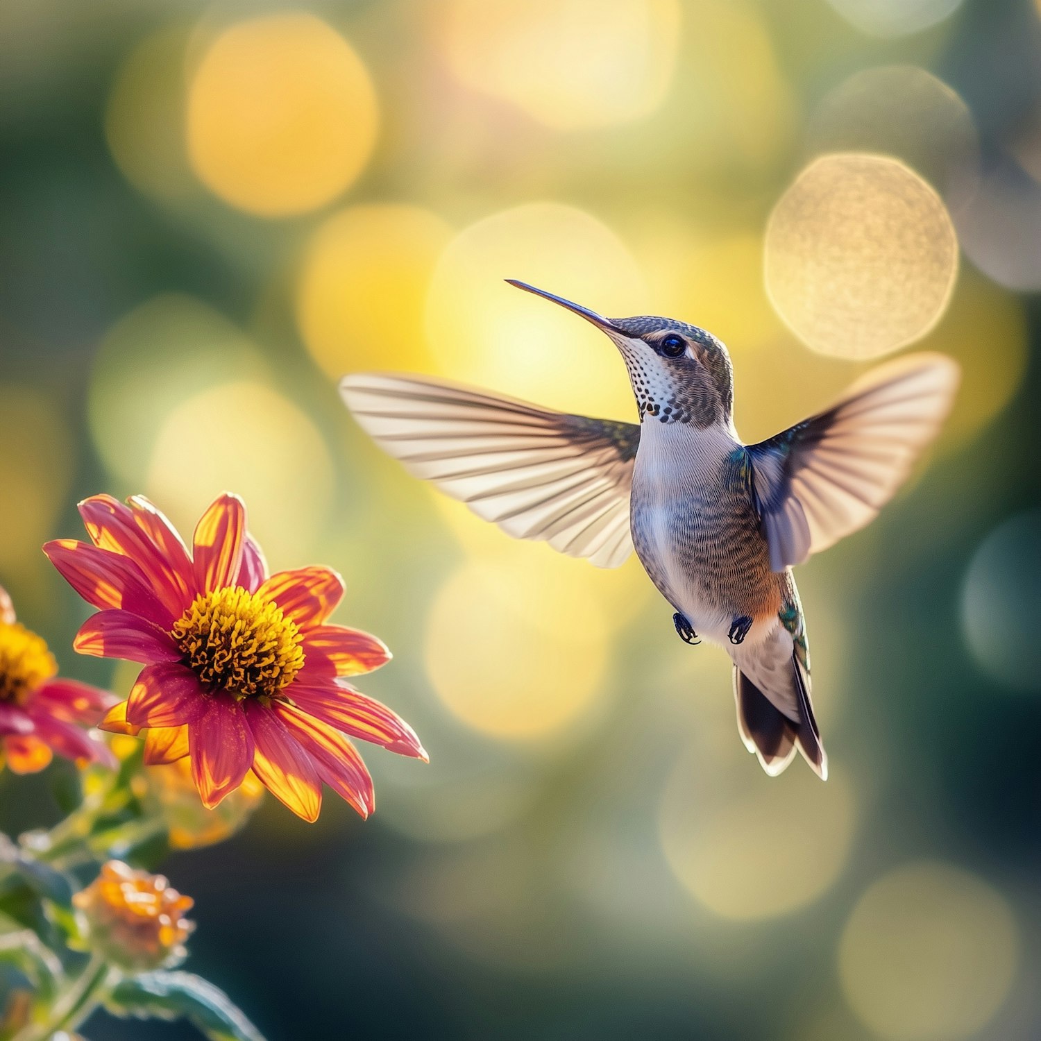 A hummingbird hovers near a vibrant orange flower, set against a dreamy bokeh background of green and yellow hues.