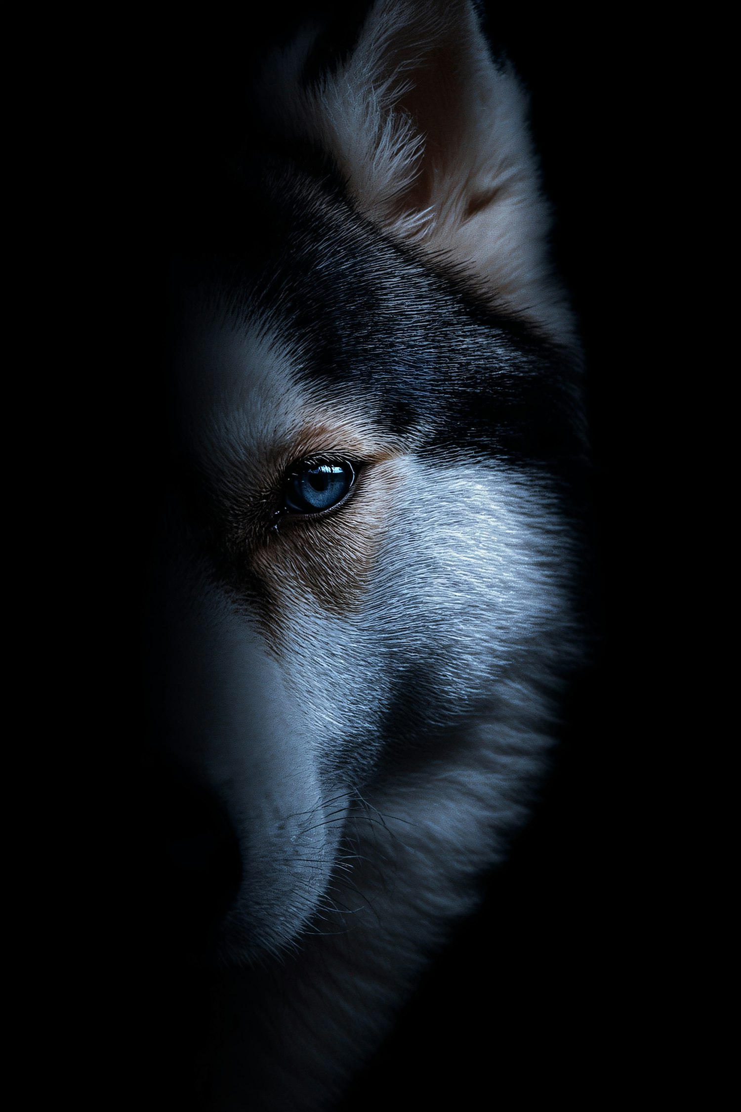 Close-up of a husky's face with a piercing blue eye, illuminated against a dark background, showcasing its striking fur texture.