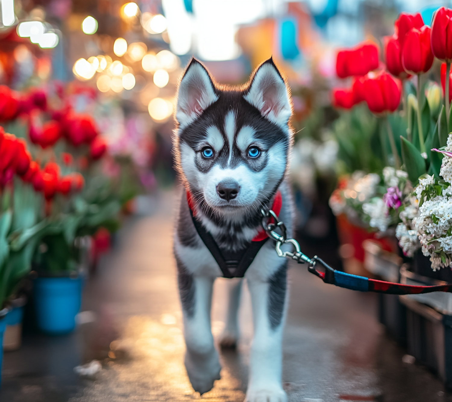 Adorable Siberian Husky puppy with blue eyes walks through a vibrant flower market, surrounded by red tulips and glowing lights.