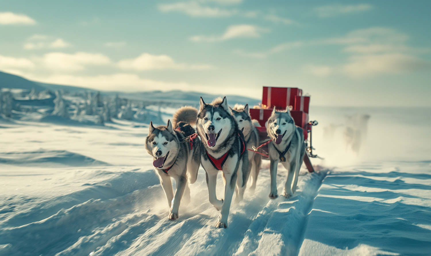 Energetic Siberian Huskies pulling a red sled through a snowy landscape under a clear blue sky, showcasing winter adventure.